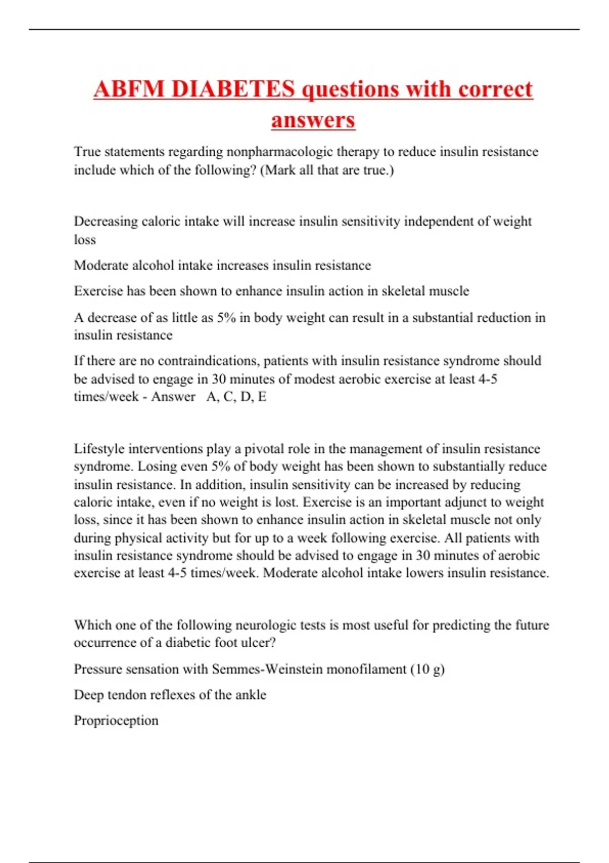 True statements regarding nonpharmacologic therapy to reduce insulin resistance include which of the following? (Mark all that are true.) Decreasing caloric intake will increase insulin sensitivity independent of weight loss Moderate alcohol intake increases insulin resistance Exercise has been shown to enhance insulin action in skeletal muscle A decrease of as little as 5% in body weight can result in a substantial reduction in insulin resistance If there are no contraindications, patients with insulin resistance syndrome should be advised to engage in 30 minutes of modest aerobic exercise at least 4-5 times/week - Answer A, C, D, E Lifestyle interventions play a pivotal role in the management of insulin resistance syndrome. Losing even 5% of body weight has been shown to substantially reduce insulin resistance. In addition, insulin sensitivity can be increased by reducing caloric intake, even if no weight is lost. Exercise is an important adjunct to weight loss, since it has been shown to enhance insulin action in skeletal muscle not only during physical activity but for up to a week following exercise. All patients with insulin resistance syndrome should be advised to engage in 30 minutes of aerobic exercise at least 4-5 times/week. Moderate alcohol intake lowers insulin resistance. Which one of the following neurologic tests is most useful for predicting the future occurrence of a diabetic foot ulcer? Pressure sensation with Semmes-Weinstein monofilament