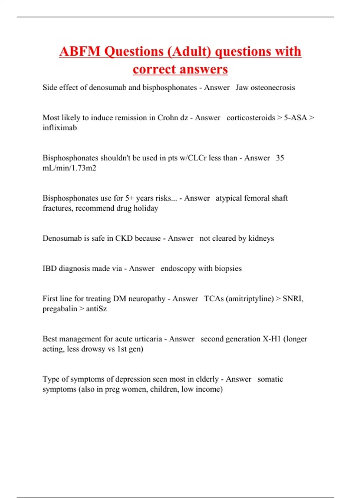 Side effect of denosumab and bisphosphonates - Answer Jaw osteonecrosis Most likely to induce remission in Crohn dz - Answer corticosteroids > 5-ASA > infliximab Bisphosphonates shouldn't be used in pts w/CLCr less than - Answer 35 mL/min/1.73m2 Bisphosphonates use for 5+ years risks... - Answer atypical femoral shaft fractures, recommend drug holiday Denosumab is safe in CKD because - Answer not cleared by kidneys IBD diagnosis made via - Answer endoscopy with biopsies First line for treating DM neuropathy - Answer TCAs (amitriptyline) > SNRI, pregabalin > antiSz Best management for acute urticaria - Answer