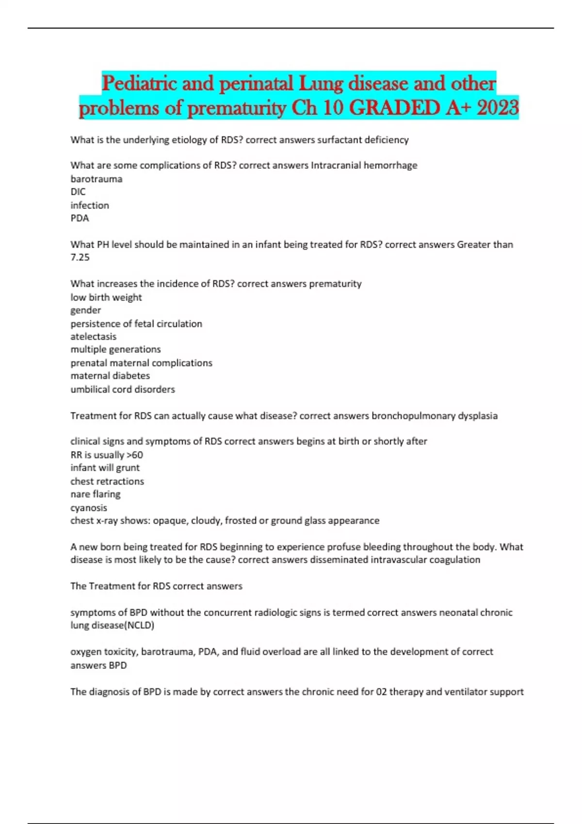 Pediatric and perinatal Lung disease and other problems of prematurity Ch 10 GRADED A+ 2023
