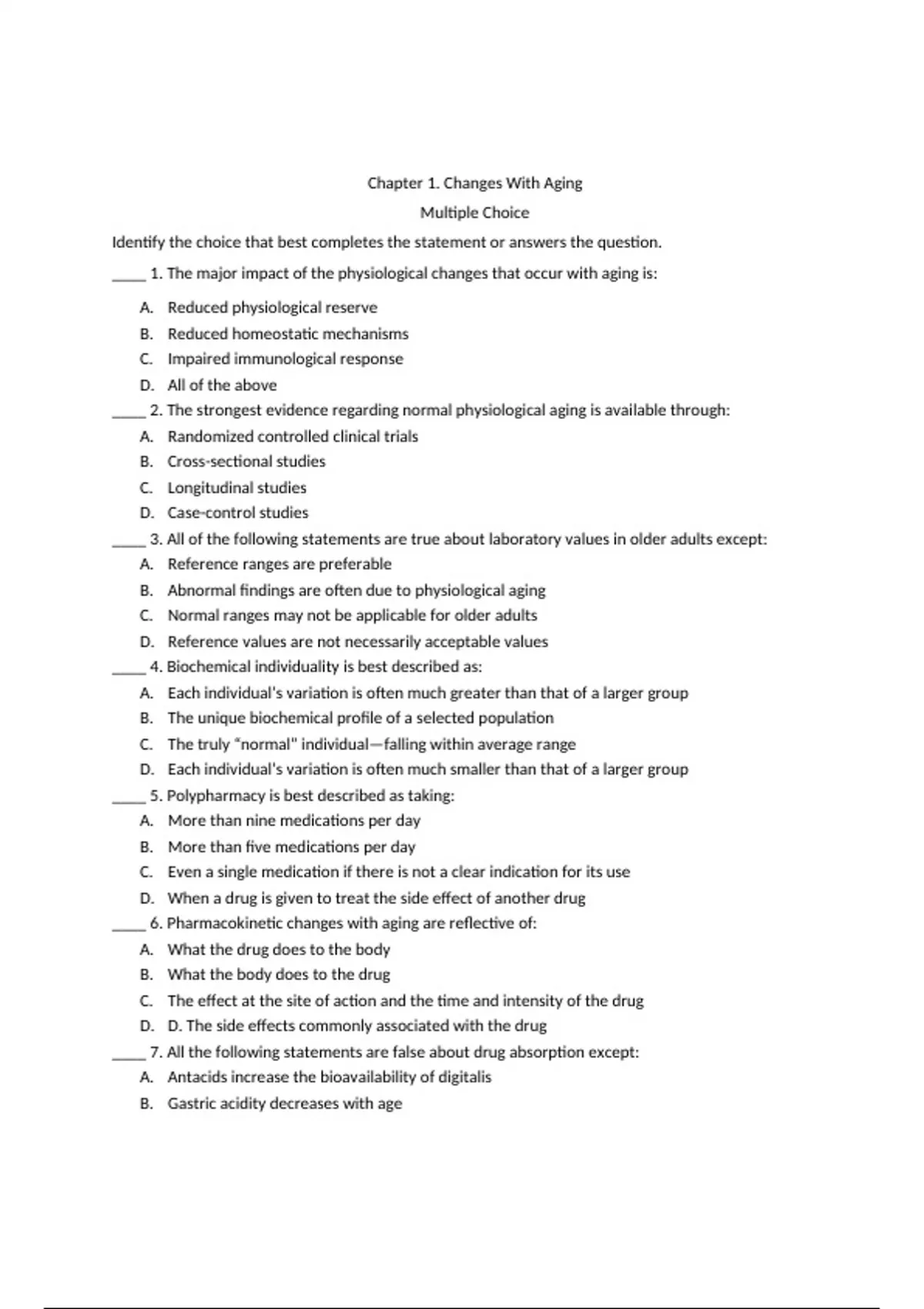 Care For Older Adults Unit 1-19 Q&A. Identify the choice that best completes the statement or answers the question. ____ 1. The major impact of the physiological changes that occur with aging is: A. Reduced physiological reserve B. Reduced homeostatic mechanisms C. Impaired immunological response D. All of the above ____ 2. The strongest evidence regarding normal physiological aging is available through: A. Randomized controlled clinical trials B. Cross-sectional studies C. Longitudinal studies D. Case-control studies ____ 3. All of the following statements are true about laboratory values in older adults except: A. Reference ranges are preferable B. Abnormal findings are often due to physiological aging C. Normal ranges may not be applicable for older adults D. Reference values are not necessarily acceptable values ____ 4. Biochemical individuality is best described as: A. Each individual’s variation is often much greater than that of a larger group B. The unique biochemical profile of a selected population C. The truly “normal” individual—falling within average range D. Each individual’s variation is often much smaller than that of a larger group ____ 5. Polypharmacy is best described as taking: A. More than nine medications per day B. More than five medications per day C. Even a single medication if there is not a clear indication for its use D. When a drug is given to treat the side effect of another drug ____ 6. Pharmacokinetic changes with aging are reflective of: A. What the drug does to the body B. What the body does to the drug C. The effect at the site of action and the time and intensity of the drug D. D. The side effects commonly associated with the drug ____ 7. All the following statements are false about drug absorption except: A. Antacids increase the bioavailability of digitalis B. Gastric acidity decreases with age C. Anticholinergics increase colonic motility D. Underlying chronic disease has little impact on drug absorption ____ 8. All of the following statements are true about drug distribution in the elderly except: A. Drugs distributed in water have lower concentration B. Drugs distributed in fat have less intense, more prolonged effect C. Drugs highly protein bound have greater potential to cause an adverse drug reaction D. The fastest way to deliver a drug to the action site is by inhalation ____ 9. Men have faster and more efficient biotransformation of drugs and this is thought to be due to: A. Less obesity rates than women B. Prostate enlargement C. Testosterone D. Less estrogen than women ____ 10. The cytochrome p system involves enzymes that are generally: A. Inhibited by drugs B. Induced by drugs C. Inhibited or induced by drugs D. Associated with decreased liver perfusion ____ 11. A statement not shown to be true about pharmacodynamics changes with aging is: A. Decreased sensitivity to oral anticoagulants B. Enhanced sensitivity to central nervous system drugs C. Drug responsiveness can be influenced by patient activity level D. There is a decreased sensitivity to beta blockers ____ 12. Atypical presentation of disease in the elderly is reflected by all the following except: A. Infection without fever B. Depression without dysphoric mood C. Myocardial infarction with chest pain and diaphoresis D. Cardiac manifestations of thyroid disease ____ 13. Functional abilities are best assessed by: A. Self-report of function B. Observed assessment of function C. A comprehensive head-to-toe examination D. Family report of function MULTIPLE CHOICE 1.ANS: D PTS: 1 2.ANS: C PTS: 1 3.ANS: B PTS: 1 4.ANS: D PTS: 1 5.ANS: C PTS: 1 6.ANS: B PTS: 1 7.ANS: D PTS: 1 8.ANS: A PTS: 1 9.ANS: C PTS: 1 10.ANS: C PTS: 1 11.ANS: A PTS: 1 12.ANS: C PTS: 1 13.ANS: B PTS: 1 Chapter 2. Health Promotion Multiple Choice Identify the choice that best completes the statement or answers the question. ____ 1. The leading cause of death in elderly travelers worldwide is: A.Cardiovascular disease B.Infections C.Accidents D.Malaria ____ 2. Which of the following should be avoided in countries where food and water precautions are to be observed? A.Hot coffee B.Bottled water C.Salad buffet D.Unpeeled bananas ____ 3. What insect precautions are not necessary to prevent insect-borne diseases in the tropics? A.Using 100% DEET on the skin to prevent bites B.Treating clothes with permethrin C.Covering up exposed skin to lessen biting surface D.Taking malaria pills as directed for areas at risk for malaria ____ 4. An example of secondary prevention you could recommend/order for older adults would be to: A. Check for fecal occult blood B. Wear seat belts in the car C. Provide foot care for a diabetic patient D. Administer a tetanus shot ____ 5. Ali is a 72-year-old man who recently came to the U.S. from Nigeria. He reports having BCG (bacille Calmette-Guerin) vaccination as a child. Which of the following is correct regarding a tuberculin skin test? A. It should not be done at all. B. It should be read as smaller than it really is. C. Vaccination history is irrelevant; read as usual. D. It should be read as larger than it really is. ____ 6. A 72-year-old woman and her husband are on a cross-country driving vacation. After a long day of driving, they stop for dinner. Midway through the meal, the woman becomes very short of breath, with chest pain and a feeling of panic. Which of the following problems is most likely? A. Pulmonary edema B. Heart failure C. Pulmonary embolism D. Pneumonia ____ 7. Ivan W. is a 65-year-old man who is new to your practice. He has a history of COPD, CAD, hypertension, and type 2 diabetes mellitus. He has had no immunizations since his discharge from the military at age 25. Childhood diseases included chickenpox, measles, mumps, and “German measles.” He presents for a disease management visit. Which of the following immunizations would you recommend for Ivan? A. MMR, influenza, pneumococcal, Zostavax B. Influenza, pneumococcal, PPD, Hepatitis B C. Tdap, pneumococcal,