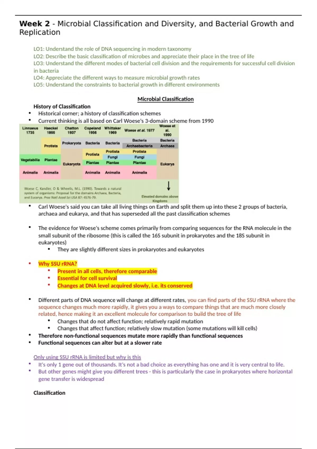 Complete lecture notes of BIO231 Microbial Physiology and Growth week 2 on microbial classification and diversity, and bacterial growth and replication. Includes all the lectures slides content along with word-for-word commentary from lecturer and in red is my personal commentary that explains some concepts in easier terms.