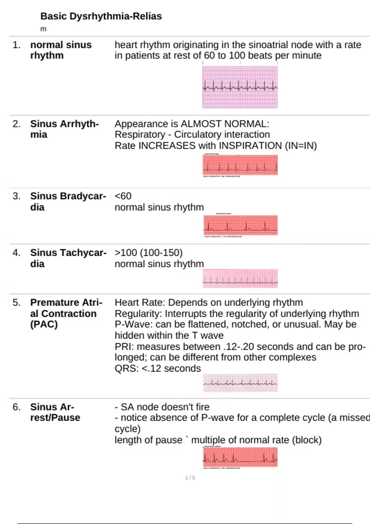 Basic Dysrhythmia-Relias normal sinus rhythm heart rhythm originating in the sinoatrial node with a rate in patients at rest of 60 to 100 beats per minute 2. Sinus Arrhythmia Appearance is ALMOST NORMAL: Respiratory - Circulatory interaction Rate INCREASES with INSPIRATION (IN=IN) 3. Sinus Bradycardia 60 normal sinus rhythm 4. Sinus Tachycardia 100 (100-150) normal sinus rhythm 5. Premature Atrial Contraction (PAC) Heart Rate: Depends on underlying rhythm Regularity: Interrupts the regularity of underlying rhythm P-Wave: can be flattened, notched, or unusual. May be hidden within the T wave PRI: measures between .12-.20 seconds and can be prolonged; can be different from other complexes QRS: .12 seconds 6. Sinus Arrest/Pause - SA node doesn't fire - notice absence of P-wave for a complete cycle (a missed cycle) length of pause ` multiple of normal rate (block)