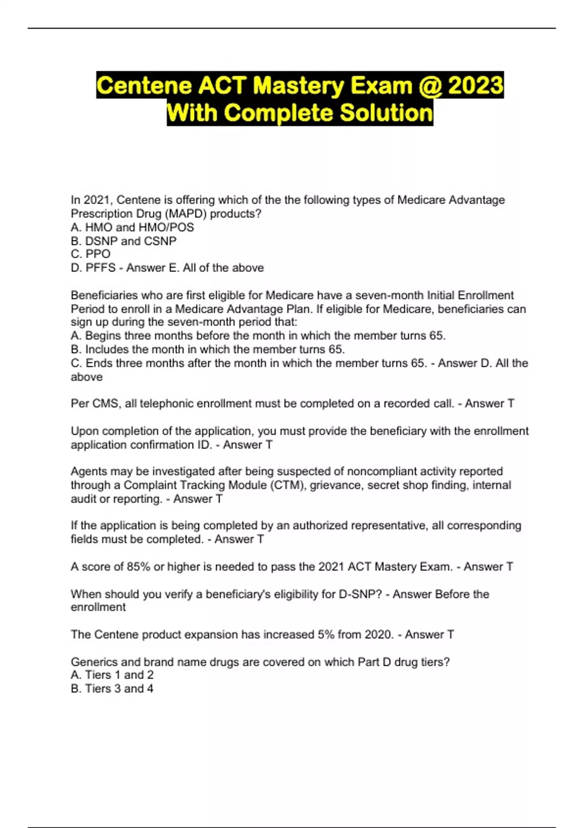 Centene ACT Mastery Exam @ 2023 With Complete Solution...