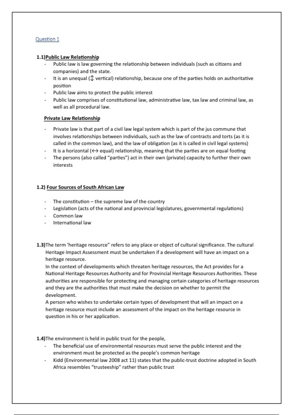 LEG_2601 Questions With Answers. Question 1 1.1)Public Law Relationship - Public law is law governing the relationship between individuals (such as citizens and companies) and the state. - It is an unequal (↕ vertical) relationship, because one of the parties holds on authoritative position - Public law aims to protect the public interest - Public law comprises of constitutional law, administrative law, tax law and criminal law, as well as all procedural law. Private Law Relationship - Private law is that part of a civil law legal system which is part of the jus commune that involves relationships between individuals, such as the law of contracts and torts (as it is called in the common law), and the law of obligation (as it is called in civil legal systems) - It is a horizontal (↔ equal) relationship, meaning that the parties are on equal footing - The persons (also called “parties”) act in their own (private) capacity to further their own interests 1.2) Four Sources of South African Law - The constitution – the supreme law of the country - Legislation (acts of the national and provincial legislatures, governmental regulations) - Common law - International law 1.3)The term ‘heritage resource” refers to any place or object of cultural significance. The cultural Heritage Impact Assessment must be undertaken if a development will have an impact on a heritage resource. In the context of developments which threaten heritage resources, the Act provides for a National Heritage Resources Authority and for Provincial Heritage Resources Authorities. These authorities are responsible for protecting and managing certain categories of heritage resources and they are the authorities that must make the decision on whether to permit the development. A person who wishes to undertake certain types of development that will an impact on a heritage resource must include an assessment of the impact on the heritage resource in question in his or her application. 1.4)The environment is held in public trust for the people, - The beneficial use of environmental resources must serve the public interest and the environment must be protected as the people’s common heritage - Kidd (Environmental law 2008 act 11) states that the public-trust doctrine adopted in South Africa resembles “trusteeship” rather than public trust - Public trust refers to a state-held resource which must be held for the benefit of the general public, referring to the free use of, or access to, such a resource by the general public - The principle of trusteeship, in contrast, entails that the trustee should protect the environment on behalf of future generations. 1.5)“Well-being” is regarded in the wider sense which includes spiritual or psychological characteristics and an individuals need to be able to connect with nature. Question 2 2.1) • To be performed “lawfully” the action must comply with all the requirements of the law. This means that the relevant prescriptions of the constitution, other legislation and case law (e.g., the sources of law) must be complied with. Any administrator must act within the powers conferred on him or her by the empowering legislation (the legislation that confers the powers). In the enabling legislation we find instructions relating to the scope and content or nature of administrative power. If any administrator exceeds the statutory powers laid down in the enabling legislation, we say that the action is ultra vires (which is unlawful). • A “reasonable” administrative action is a decision based on the consideration of all the relevant and objective facts and circumstances. A reasonable decision is therefore a decision based on reason and not based on, for e.g., subjective opinion. A reasonable decision is a suitable and necessary decision in the circumstances and reflects that the administrator has weighed up the advantages and disadvantages before reaching the decision. In terms of PAJA, an unreasonable administrative action is so unreasonable that no reasonable person could have so exercised the power or performed the function. • The obligation to comply with “fair procedures” requires that both parties involved in the case have the opportunity to present their side of the story to the presiding officer, and that the presiding officer must be objective and impartial when making a decision on the matter. These are known as the rules of natural justice, which has been included in PAJA. 2.2) Besides their powers, which include: • Questioning suspects • Issuing written notices where people refuse to answer questions • Inspecting and copying any relevant book or document, as well as taking photographs and samples relevant to any investigation, EMIs also have the following specific powers: • May issue a compliance notice if a person has not complied with a term or condition of a permit, authorisation, license or the provisions of environmental legislation. • May give an offender an admission of guilt fine instead of being tried by a court for the offense. • Has the power to seize any item as well as to stop, enter and search vehicles, vessels and aircraft. • Can carry out routine inspections on buildings, land or premises to ascertain that there is compliance with the legislation or any permit or authorisation issues.