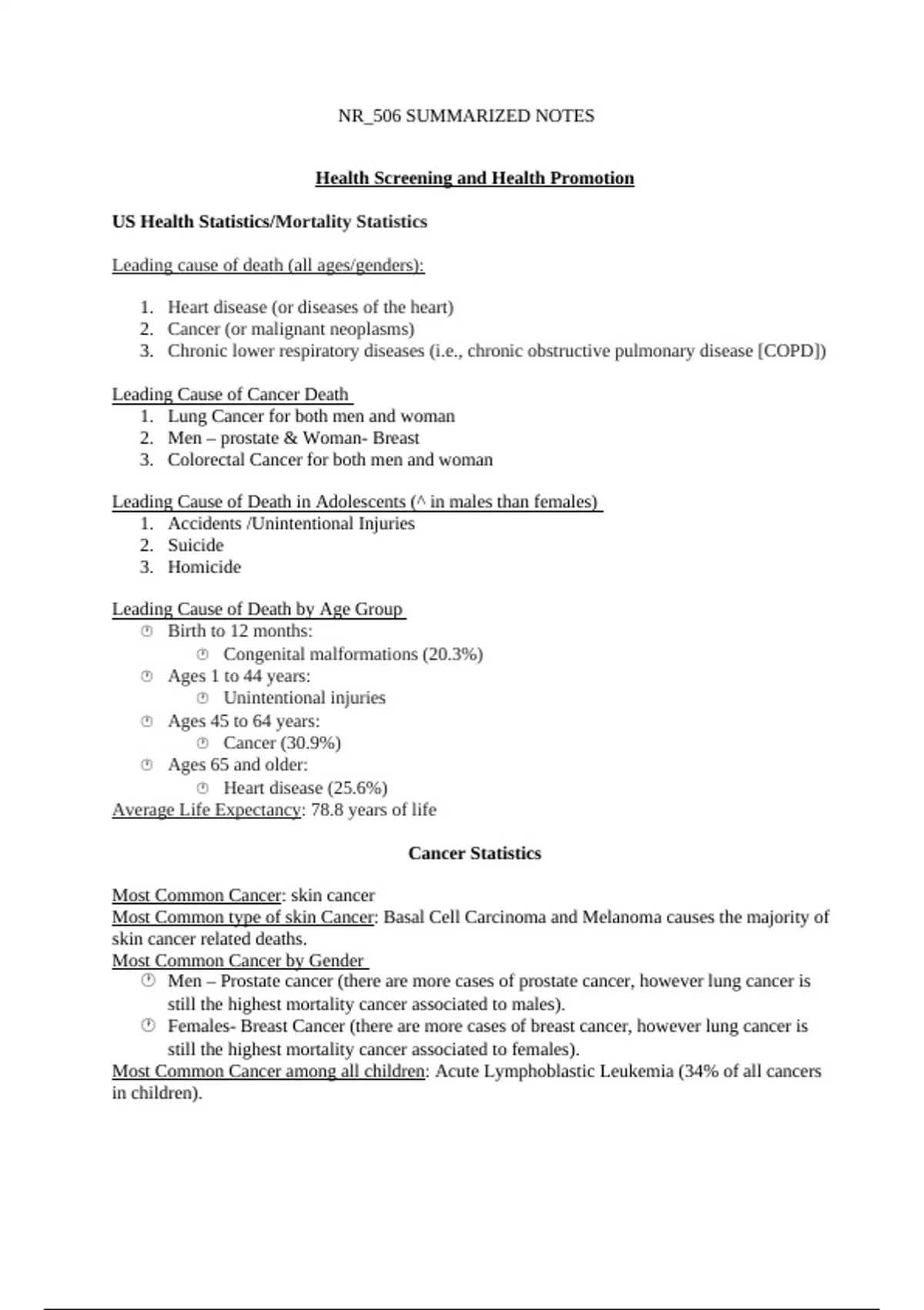 NR_506 Summarized Notes. US Health Statistics/Mortality Statistics Leading cause of death (all ages/genders): 1. Heart disease (or diseases of the heart) 2. Cancer (or malignant neoplasms) 3. Chronic lower respiratory diseases (i.e., chronic obstructive pulmonary disease [COPD]) Leading Cause of Cancer Death 1. Lung Cancer for both men and woman 2. Men – prostate & Woman- Breast 3. Colorectal Cancer for both men and woman Leading Cause of Death in Adolescents (^ in males than females) 1. Accidents /Unintentional Injuries 2. Suicide 3. Homicide Leading Cause of Death by Age Group Birth to 12 months: Congenital malformations (20.3%) Ages 1 to 44 years: Unintentional injuries Ages 45 to 64 years: Cancer (30.9%) Ages 65 and older: Heart disease (25.6%) Average Life Expectancy: 78.8 years of life Cancer Statistics Most Common Cancer: skin cancer Most Common type of skin Cancer: Basal Cell Carcinoma and Melanoma causes the majority of skin cancer related deaths. Most Common Cancer by Gender Men – Prostate cancer (there are more cases of prostate cancer, however lung cancer is still the highest mortality cancer associated to males). Females- Breast Cancer (there are more cases of breast cancer, however lung cancer is still the highest mortality cancer associated to females). Most Common Cancer among all children: Acute Lymphoblastic Leukemia (34% of all cancers in children). Sensitivity vs. Specificity Sensitivity: is a good way of detecting those people who have the disease (i.e. true positive). Specificity: is a good way of detecting those people without the disease (i.e. true negative). Top Three Cancers in Children Leukemia (34%) Brain and nervous system tumors (27%) Neuroblastoma (7%) Health Promotion Aspirin Use to prevent Cardiovascular Disease or Colorectal Cancer Begin at age 50-59 with =/ 10 % risk for cardiovascular disease (ASCVD score) Breast Cancer Risk factors o age 50 or greater, o previous hx of breast CA, o two or more first * relatives o nulliparity, early menarche, late menopause (longer exposure to estrogen) o Obesity (adipose cells can synthesize small amounts of estrogen) Baseline mammogram starts at 50 years of age Repeat every 2 years from ages 50-74 years of age NOTE: Does NOT apply to those individuals with known genetic mutations (BRCA1 or 2), familial breast cancer history, history of chest radiation at a young age or previously diagnosed with high risk breast lesions, who may benefit from starting screenings at age 40. So, essentially if at high risk start screenings at age 40-49. Cervical Cancer Risk factors o Multiple sexual partners o Younger age onset of sex o Immunosuppressed and/ or smoking individuals. Age Group Recommendations for Pap/Liquid Cytology Age 20 years or younger Do not screen (even if sexually active with multiple partners). rare before age 21 Age 21 to 65 years Baseline at age 21 years. Screen every 3 years. Age 30 to 65 years Another option starting at age 30 years is to screen with combination of cytology plus human papillomavirus (HPV) testing every 5 years. Had hysterectomy with removal of cervix If hysterectomy with cervical removal was not due to cervical intraepithelial neoplasia (CIN grade 2) or cervical cancer, then can stop screening. Age Group Recommendations for Pap/Liquid Cytology Women older than 65 years who had adequate prior screening Do not screen if history of adequate prior screening and is otherwise not at high risk for cervical cancer. Colorectal Cancer Risk factors o Familial history of polyposis (multiple polyps on colon) o 1 st * relative with colon cancer o Chron’s disease (ulcerative colitis) Start at age 50-74 years of age is routine screenings Age 76-85 years of age: against routine screening, but may have individual considerations for screening. Screening Modalities for Colorectal Cancer o High-sensitivity fecal occult blood test (gFOBT) for three consecutive stool samples annually o Flexible sigmoidoscopy or CT colonography every 5 years o Colonoscopy every 10 years Lipid Disorders Must be fasting for a minimum of 9 hours. 40-74 years of age Must have 1 or more risk factors i.e.- dyslipidemia, DM, HTN, and/ or smoking. ASCVD of 10 % or greater Lung Cancer Screening for individuals who smoke 30 pack-years or have quit in the past 15 years. Age 55-80 years of life – low dose CT Prostate Cancer Risk Factors o 50 years or older o African Ancestry o 1 st * relative with prostate cancer. Does not recommend PSA screening for prostate CA. The benefits do NOT outweigh the disadvantages. Ovarian Cancer Very high-risk women with BRCA1/BRCA2 mutations: Refer to specialists. If ovarian cancer screening is done, transvaginal ultrasound with serum cancer antigen (CA-125) is ordered. Screening starts at age 30 Some recommend BSO between age 35-40 years of life. Who is at high risk? o Look for family history of having two or more first- to second-degree relatives with a history of ovarian cancer or a combination of ovarian cancer; women of Ashkenazi Jewish ethnicity with first-degree relative (or second-degree relatives on the same side of the family) with breast or ovarian cancer. Skin Cancer Counseling Should occur starting at age 10-24 with fair skin. Should avoid sunlight from 10am-to- 4 pm and use of 15 spf sunblock or higher, protective clothing, wide brim hats. No Routine Screening for the following Ovarian cancer Oral cancer Prostate cancer Testicular cancer General Recap of Screening Recommendations Vaccination Facts Hepatitis B Vaccine Total of 3 doses with one given at birth and 4 weeks given between 1st and 2nd dose. If patient only one dose of hep B vaccine? o Do not restart the series, just give the second dose. Then given 3rd when time permits. Influenza Vaccination 6 months is the youngest age at which it can be given. Most flu vaccinations are manufactures using egg-based technology. o Note: only 1.3% of children and only 0.02 % of adults have egg allergies. Use caution with pt’s with previous reactions,