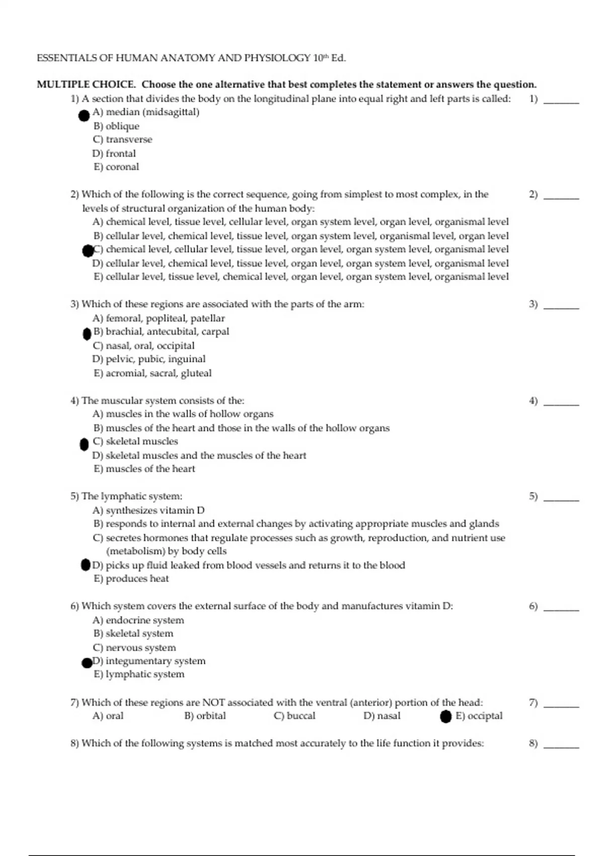 Essentials Of Human Anatomy and Physiology 10th Ed. MULTIPLE CHOICE. Choose the one alternative that best completes the statement or answers the question. 1) A section that divides the body on the longitudinal plane into equal right and left parts is called: 1) _______ A) median (midsagittal) B) oblique C) transverse D) frontal E) coronal 2) Which of the following is the correct sequence, going from simplest to most complex, in the levels of structural organization of the human body: 2) _______ A) chemical level, tissue level, cellular level, organ system level, organ level, organismal level B) cellular level, chemical level, tissue level, organ system level, organismal level, organ level C) chemical level, cellular level, tissue level, organ level, organ system level, organismal level D) cellular level, chemical level, tissue level, organ level, organ system level, organismal level E) cellular level, tissue level, chemical level, organ level, organ system level, organismal level 3) Which of these regions are associated with the parts of the arm: 3) _______ A) femoral, popliteal, patellar B) brachial, antecubital, carpal C) nasal, oral, occipital D) pelvic, pubic, inguinal E) acromial, sacral, gluteal 4) The muscular system consists of the: 4) _______ A) muscles in the walls of hollow organs B) muscles of the heart and those in the walls of the hollow organs C) skeletal muscles D) skeletal muscles and the muscles of the heart E) muscles of the heart 5) The lymphatic system: 5) _______ A) synthesizes vitamin D B) responds to internal and external changes by activating appropriate muscles and glands C) secretes hormones that regulate processes such as growth, reproduction, and nutrient use (metabolism) by body cells D) picks up fluid leaked from blood vessels and returns it to the blood E) produces heat 6) Which system covers the external surface of the body and manufactures vitamin D: 6) _______ A) endocrine system B) skeletal system C) nervous system D) integumentary system E) lymphatic system 7) Which of these regions are NOT associated with the ventral (anterior) portion of the head: 7) _______ A) oral B) orbital C) buccal D) nasal E) occiptal 8) Which of the following systems is matched most accurately to the life function it provides: 8) _______ A) respiratory system - digestion B) nervous system - excretion C) muscular system - maintaining boundaries D) integumentary system - movement E) nervous system - responsiveness 9) Which of the following elements of a control system detects a change: 9) _______ A) receptor B) control center C) effector D) stimulus E) efferent pathway 10) Which of the following statements is correct regarding the location of the spleen and stomach: 10) ______ A) both of these organs are located medially B) both of these organs are located in the left upper quadrant C) the spleen is located in the left upper quadrant and the stomach is located in the right upper quadrant D) both of these organs are located in the right upper quadrant E) the spleen is located in the right upper quadrant and the stomach is located in the left upper quadrant 11) Which of these is NOT a survival need: 11) ______ A) oxygen B) water C) reproduction D) body temperature E) nutrients 12) Which of the following is the correct order of elements in a control system: 12) ______ A) receptor, stimulus, afferent pathway, control center, efferent pathway, effector, response B) stimulus, receptor, efferent pathway, control center, afferent pathway, effector, response C) receptor, stimulus, efferent pathway, control center, afferent pathway, effector, response D) stimulus, receptor, afferent pathway, control center, efferent pathway, effector, response E) effector, stimulus, efferent pathway, control center, afferent pathway, receptor, response 13) Which of the following activities does not represent an anatomical study: 13) ______ A) viewing muscle tissue through a microscope B) studying how the nerves conduct electrical impulses C) observing the parts of a reproducing cell D) examining the surface of a bone E) making a section through the heart to observe its interior 14) The dorsal body cavity houses the: 14) ______ A) heart and lungs B) spinal cord and brain C) tongue D) urinary and reproductive organs E) digestive and reproductive organs 15) The stomach, liver, intestines, bladder, rectum, and reproductive organs are housed in the: 15) ______ A) abdominopelvic cavity B) dorsal cavity C) spinal cavity D) cranial cavity E) thoracic cavity 16) Which of the following is NOT a necessary life function: 16) ______ A) nutrients B) maintaining boundaries C) movement D) responsiveness E) metabolism 17) The study of the function of the body and body parts is called: 17) ______ A) homeostasis B) anatomy C) physiology D) irritability E) negative feedback 18) Which of these regions in the abdominopelvic cavity are medial: 18) ______ A) epigastric, umbilical, and hypogastric regions B) umbilical, right lumbar, and left lumbar regions C) epigastric, right, and left hypochondriac regions D) iliac (inguinal), lumbar, and hypogastric regions E) right and left iliac (inguinal), and hypogastric regions 19) The region that contains the navel is the: 19) ______ A) umbilical region B) orbital region C) carpal region D) anterior knee E) inguinal region 20) The gluteal region is the: 20) ______ A) posterior knee area B) posterior surface of the head C) shoulder blade region D) buttock E) curve of the shoulder 21) Which of the following orientation terms have opposite meanings (in humans): 21) ______ A) medial and anterior B) superficial and proximal C) posterior and intermediate D) distal and proximal E) medial and distal 22) Your body thermostat is located in a part of the brain called the hypothalamus. Which of the following elements of a control system does this area in the brain represent: 22) ______ A) stimulus B) afferent pathway C) efferent pathway D) effector E) control center 23) The ovary is part of which o