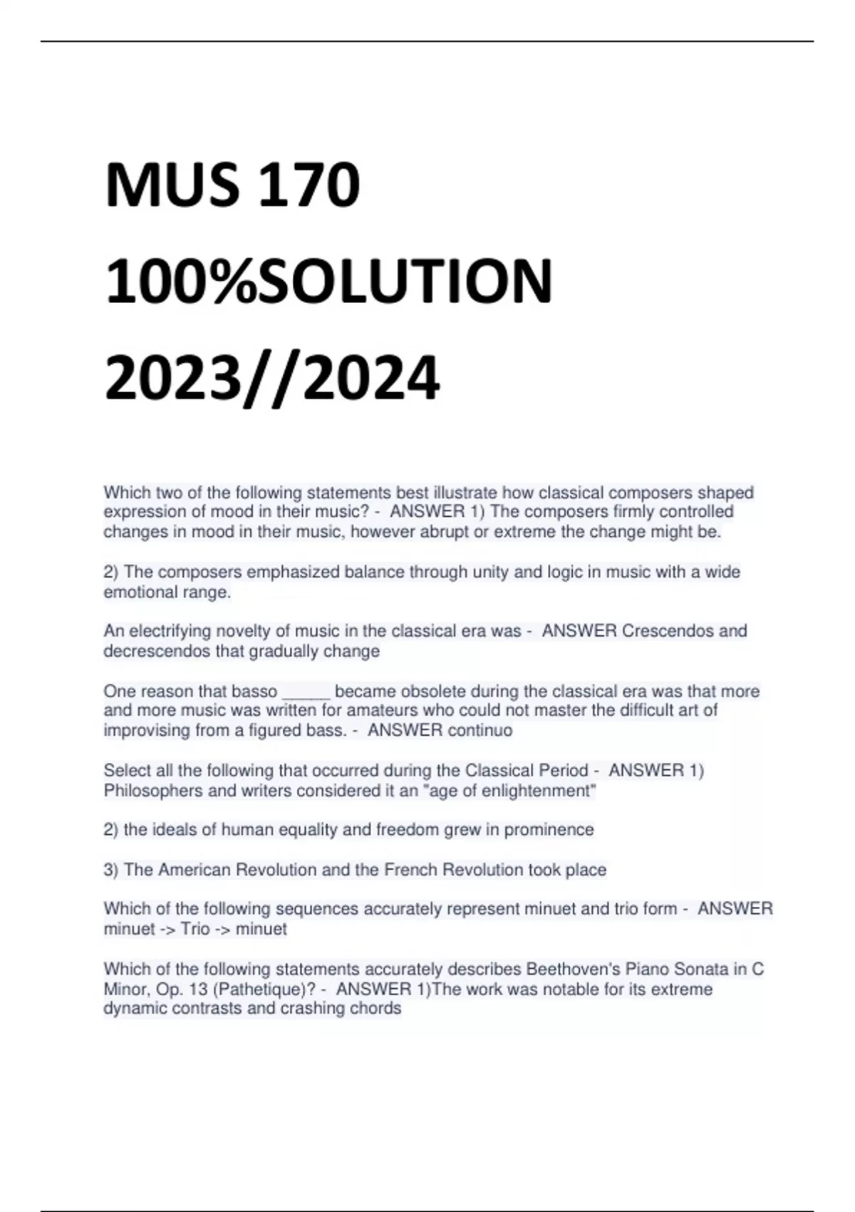 MUS 170 100%SOLUTION 2023//2024 Which two of the following statements best illustrate how classical composers shaped expression of mood in their music? - ANSWER 1) The composers firmly controlled changes in mood in their music, however abrupt or extreme the change might be. 2) The composers emphasized balance through unity and logic in music with a wide emotional range. An electrifying novelty of music in the classical era was - ANSWER Crescendos and decrescendos that gradually change One reason that basso _____ became obsolete during the classical era was that more and more music was written for amateurs who could not master the difficult art of improvising from a figured bass. - ANSWER continuo Select all the following that occurred during the Classical Period - ANSWER 1) Philosophers and writers considered it an "age of enlightenment" 2) the ideals of human equality and freedom grew in prominence 3) The American Revolution and the French Revolution took place Which of the following sequences accurately represent minuet and trio form - ANSWER minuet -> Trio -> minuet Which of the following statements accurately describes Beethoven's Piano Sonata in C Minor, Op. 13 (Pathetique)? - ANSWER 1)The work was notable for its extreme dynamic contrasts and crashing chords 2) the work foreshadows romanticism in music 3) some of the passages in this sonata reflect Beethoven's powers at improvisation Which of the following best describes the balance and symmetry in a typical melody of the classical era having the form A A'? - ANSWER a phrase with an inconclusive ending followed by a phrase with a conclusive ending