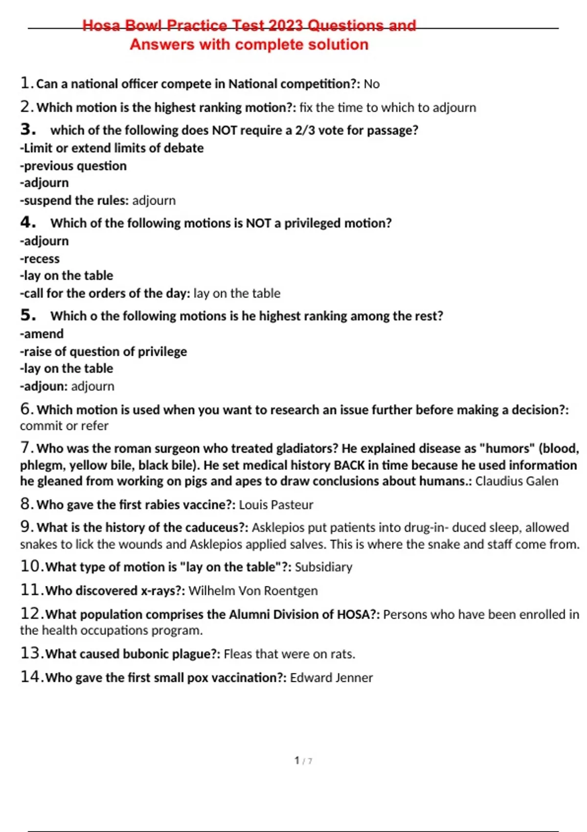 1. Can a national officer compete in National competition?: No 2. Which motion is the highest ranking motion?: fix the time to which to adjourn 3. which of the following does NOT require a 2/3 vote for passage? -Limit or extend limits of debate -previous question -adjourn -suspend the rules: adjourn 4. Which of the following motions is NOT a privileged motion? -adjourn -recess -lay on the table -call for the orders of the day: lay on the table 5. Which o the following motions is he highest ranking among the rest? -amend -raise of question of privilege -lay on the table -adjoun: adjourn 6. Which motion is used when you want to research an issue further before making a decision?: commit or refer 7. Who was the roman surgeon who treated gladiators? He explained disease as "humors" (blood, phlegm, yellow bile, black bile). He set medical history BACK in time because he used information he gleaned from working on pigs and apes to draw conclusions about humans.: Claudius Galen 8. Who gave the first rabies vaccine?: Louis Pasteur 9. What is the history of the caduceus?: Asklepios put patients into drug-in- duced sleep, allowed snakes to lick the wounds and Asklepios applied salves. This is where the snake and staff come from. 10. What type of motion is "lay on the table"?: Subsidiary 11. Who discovered x-rays?: Wilhelm Von Roentgen 12. What population comprises the Alumni Division of HOSA?: Persons who have been enrolled in the health occupations program. 13. What caused bubonic plague?: Fleas that were on rats. 14. Who gave the first small pox vaccination?: Edward Jenner 15. Who makes up the executive council?: All officers of National Hosa and the National Office Advisor 16. What portion of vote must an honorary member have to be conferred for life?: 3/4 17. Who invented penicillin?: Alexander Fleming 18. How many times a year does the executive council meet?: At least 2 times per year. 19. When are Hosa affiliation fees due for students who enroll after January 1?: March 1 20. Who introduced ether to make patients comfortable?: WTG Morton 21. Who disproved Galen?: Vesalius 22. Who helped stomp out yellow fever which lead to building of Panama Canal?: Walter Reed 23. What year were birth control pills approved by the FDA?: 1960 24. Who are honorary members of HOSA?: Those who have made significant contributions to the development of Hosa and/or have the organization. 25. What is the Hosa slogan?: HOE and Hosa: A Healthy Partnership 26. What surgeon in the war of 1812 treated a bullet wound in the stomach and used the open area as a laboratory to study the action of the stomach?- : William Beaumont 27. Who performed the first heart transplant, and in what year?: Christian Barnard in 1968 28. What type of students can be Hosa members?: Those who are or have been enrolled in Vocational Health Occupations Education classes or professional members. 29. Who was the first woman doctor?: Elizabeth Blackwell 30. "Call for the orders of the day" is what type of motion?: Privileged 31. Who was the founder of modern nursing?: Florence Nightingale 32. In a committee what does a quorum consist of?: A majority of the commit- tee members, excluding ex-officio members 33. If you are late for a meeting or forgot to acknowledge your presence, what do you do?: Forward a note to the chair to be counted as present and voting.