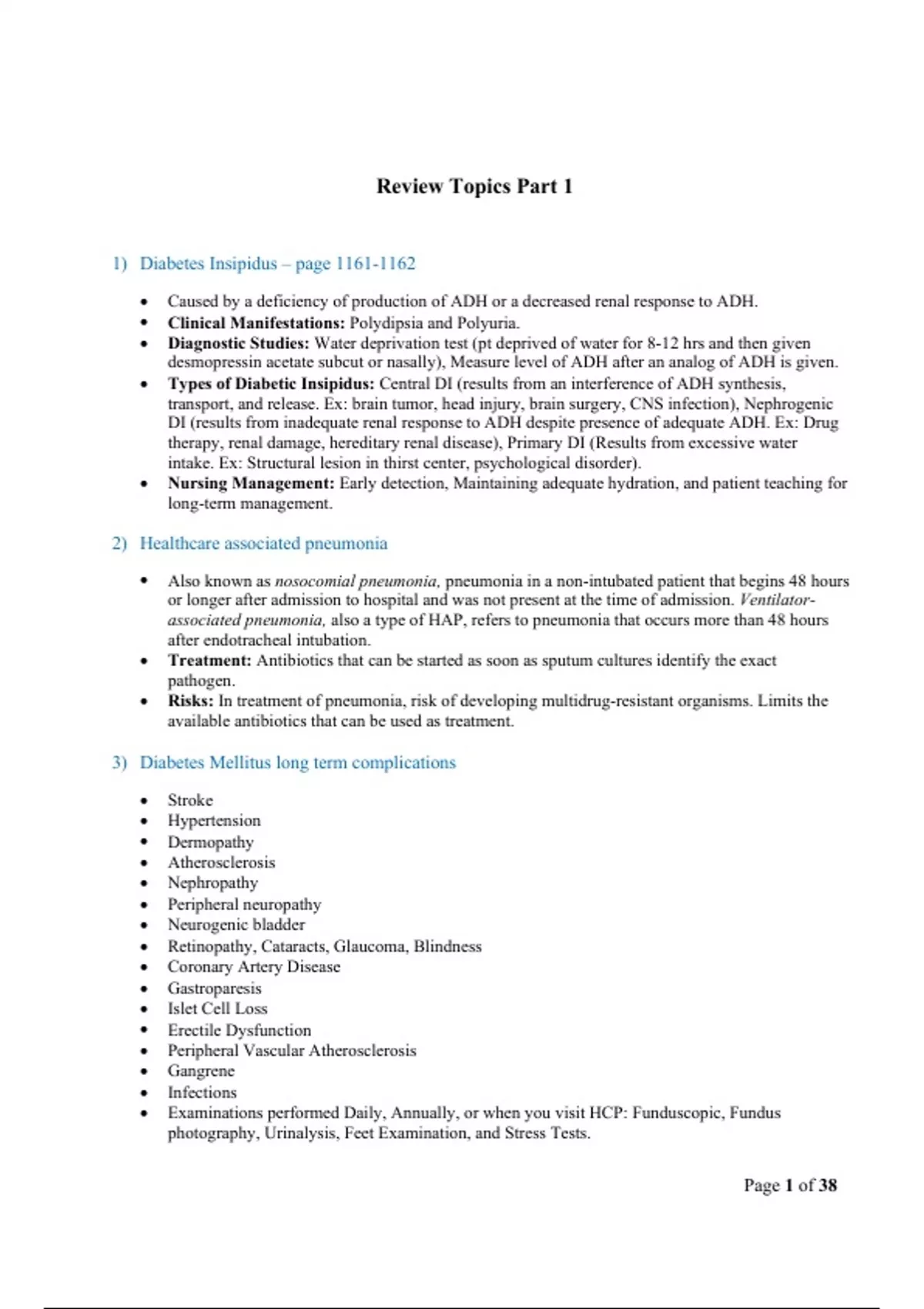 Med_Surg Summary Notes. 1) Diabetes Insipidus – page Caused by a deficiency of production of ADH or a decreased renal response to ADH. Clinical Manifestations: Polydipsia and Polyuria. Diagnostic Studies: Water deprivation test (pt deprived of water for 8-12 hrs and then given desmopressin acetate subcut or nasally), Measure level of ADH after an analog of ADH is given. Types of Diabetic Insipidus: Central DI (results from an interference of ADH synthesis, transport, and release. Ex: brain tumor, head injury, brain surgery, CNS infection), Nephrogenic DI (results from inadequate renal response to ADH despite presence of adequate ADH. Ex: Drug therapy, renal damage, hereditary renal disease), Primary DI (Results from excessive water intake. Ex: Structural lesion in thirst center, psychological disorder). Nursing Management: Early detection, Maintaining adequate hydration, and patient teaching for long-term management. 2) Healthcare associated pneumonia Also known as nosocomial pneumonia, pneumonia in a non-intubated patient that begins 48 hours or longer after admission to hospital and was not present at the time of admission. Ventilatorassociated pneumonia, also a type of HAP, refers to pneumonia that occurs more than 48 hours after endotracheal intubation. Treatment: Antibiotics that can be started as soon as sputum cultures identify the exact pathogen. Risks: In treatment of pneumonia, risk of developing multidrug-resistant organisms. Limits the available antibiotics that can be used as treatment. 3) Diabetes Mellitus long term complications Stroke Hypertension Dermopathy Atherosclerosis Nephropathy Peripheral neuropathy Neurogenic bladder Retinopathy, Cataracts, Glaucoma, Blindness Coronary Artery Disease Gastroparesis Islet Cell Loss Erectile Dysfunction Peripheral Vascular Atherosclerosis Gangrene Infections Examinations performed Daily, Annually, or when you visit HCP: Funduscopic, Fundus photography, Urinalysis, Feet Examination, and Stress Tests. Page 2 of 38 4) Renal dosing/ issues with drugs – page 1020 Box 44-3 ANTIBIOTICS OTHER DRUGS OTHER AGENTS Amikacin Captopril Gold Amphotericin B Cimetidine Heavy Metals Bacitracin Cisplatin Cephalosporins Cocaine Gentamicin Cyclosporine Neomycin Ethylene Glycol Polymyxin B Heroin Streptomycin Lithium Sulfamidies Methotrexate Tobramycin Nitrosoureas Vancomycin NSAIDS Phenacetin Quinine Rifampin Salicylates 5) Spinal cord injury – page Classification: (1) Mechanism of Injury, (2) Level of Injury, (3) Degree of Injury. Clinical Manifestations: Motor and Sensory effects, Respiratory System (decrease in vital capacity volume), Cardiovascular System (bradycardia, peripheral vasodilation, hypotension), Urinary System (urinary dysfunction), Gastrointestinal System (incontinence, impaction, ileus, megacolon, decreased GI secretion) , Integumentary System (skin breakdown, pressure ulcers), Thermoregulation (Adjustment from body temp to room temp), Peripheral Vascular Problems (Pain, VTE, PE) Emergency Management: Table 60-3 Ph. 1425 NURSING ASSESSMENT o Subjective Date: Health History o Objective Data: Poikilothermism (unable to regulate body heat) o Integumentary System: Warm dry skin below level of injury o Respiratory: Injury at C1-3-Apnea, Inability to cough. Injury at C4-Poor Cough, diaphragmatic breathing, hypoventilation. Injury at C5-T6- Decreased respiratory reserve. o Cardiovascular: Injury above T6-Bradycardia, hypertension, absence of vasomotor tone. o Gastrointestinal: Decreased or absent bowel sounds, abdominal distension, constipation, fecal incontinence, fecal impaction. o Urinary: Retention, flaccid bladder, Spasticity with reflex bladder emptying. o Reproductive: Priapism, altered sexual function o Neurologic: Complete-Areflexic, flaccid paralysis, hyperactive deep tendon reflexes, bilaterally positive Babinski test. Incomplete- Mixed loss of voluntary motor activity and sensation. o Musculoskeletal: Muscle atony, Contractures. o Pain: Neuropathic, musculoskeletal, and/or visceral. Page 3 of 38 6) Blood in stool Melena = black, tarry stools (often foul smelling) caused by digestion of blood in the GI tract. Black appearance is from the presence of iron. Occult bleeding = small amounts of blood in gastric secretions, vomitus, or stools not apparent by appearance. Detectable by guaiac test. Could be indication of an upper GI bleed Hemorrhoids are the most common reason for bleeding with defecation o Focus on pain control and promote wound healing o Sitz bath 1 to 2 days after surgery and continue for 1 to 2 weeks o Teach the pt importance of diet, care of the anal area, symptoms of bleeding complications, and avoidance of constipation and straining 7) CVA (focus on vision issues) Cerebral vascular accident / Stroke Treat as medical emergency Know FAST (Facial drooping, Arm weakness, Speech difficulties, Time) Sudden trouble seeing in one eye should be reported immediately for indication of a CVA Women who experience migraine with aura are at an increased risk for stroke. 8) Acute kidney injury Slight deterioration in function to severe impairment Rise in serum creatinine and/or a reduction in urine output, and sometimes leads to development of azotemia (accumulation of nitrogenous waste products in the blood) Hospitalized patients develop AKI at a high rate and have a high mortality rate Common causes: o Prerenal: Hypovolemia, Decreased Cardiac Output, Decreased Peripheral Vascular Resistance, Decreased Renovascular Blood Flow o Intrarenal: Nephrotoxic injury, Interstitial Nephritis o Postrenal: BPH, bladder cancer, calculi formation, trauma Clinical manifestations: o Urinary changes – oliguria o Hypovolemia o Metabolic Acidosis o Sodium balance o Potassium excess o Hematologic disorders o Waste product accumulation o Neurologic disorders Diagnostic studies: o H&P o Identification of precipitating cause o Serum creatinine and BUN levels o Electrolytes o Urinalysis o Renal Ultrasound o Renal scan o CT scan Primary treatment 