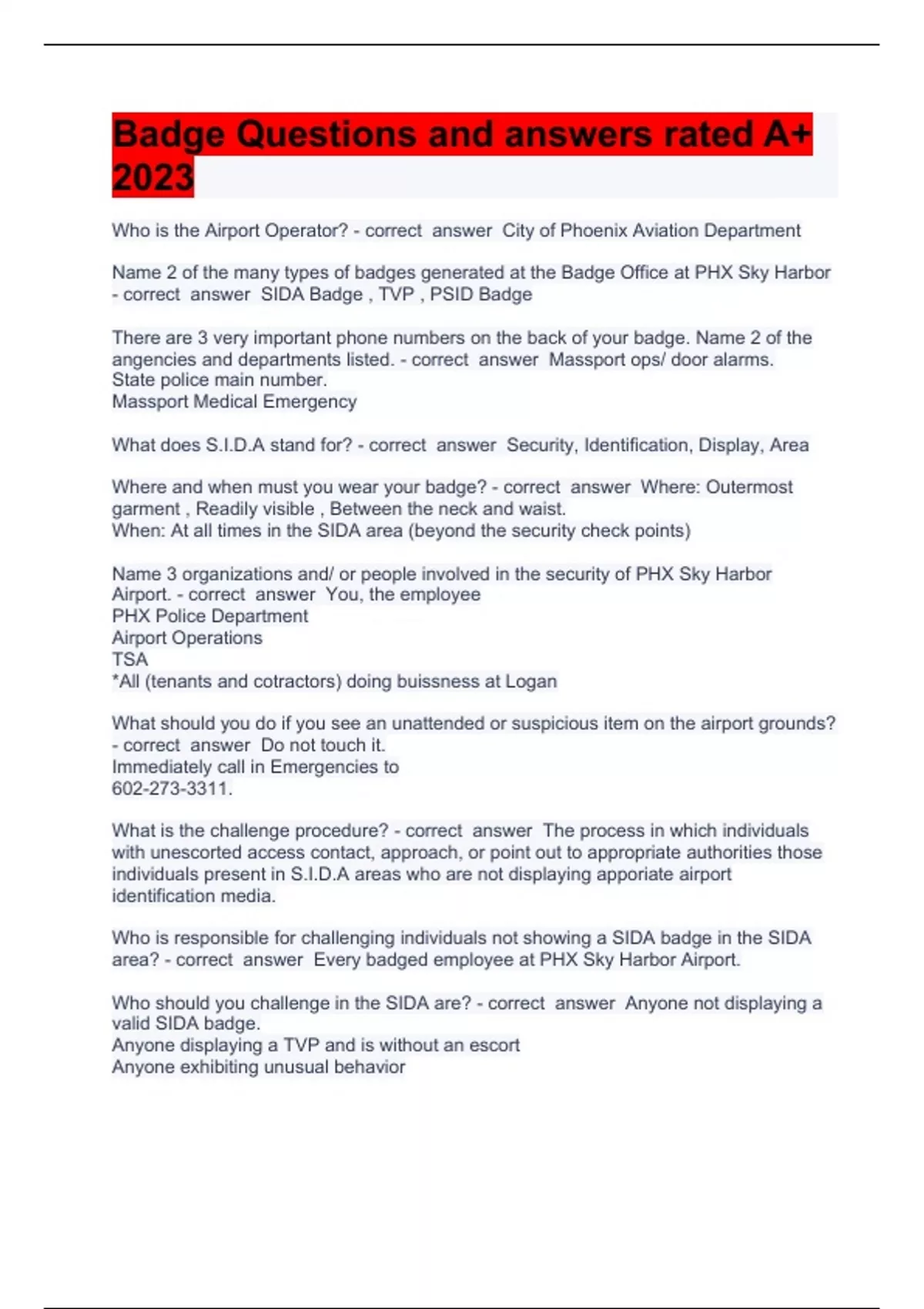 Badge Questions and answers rated A+ 2023Who is the Airport Operator? City of Phoenix Aviation Department Name 2 of the many types of badges generated at the Badge Office at PHX Sky Harbor SIDA Badge , TVP , PSID Badge There are 3 very important phone numbers on the back of your badge. Name 2 of the angencies and departments listed. Massport ops/ door alarms. State police main number. Massport Medical Emergency What does S.I.D.A stand for? Security, Identification, Display, Area Where and when must you wear your badge? Where: Outermost garment , Readily visible , Between the neck and waist. When: At all times in the SIDA area (beyond the security check points) Name 3 organizations and/ or people involved in the security of PHX Sky Harbor Airport. You, the employee PHX Police Department Airport Operations TSA *All (tenants and cotractors) doing buissness at Logan What should you do if you see an unattended or suspicious item on the airport grounds? Do not touch it. Immediately call in Emergencies to . What is the challenge procedure? The process in which individuals with unescorted access contact, approach, or point out to appropriate authorities those individuals present in S.I.D.A areas who are not displaying apporiate airport identification media. Who is responsible for challenging individuals not showing a SIDA badge in the SIDA area? Every badged employee at PHX Sky Harbor Airport. Who should you challenge in the SIDA are? Anyone not displaying a valid SIDA badge. Anyone displaying a TVP and is without an escort Anyone exhibiting unusual behavior What is the first step to take when you approach a badge reader to gain access through a door? Place your badge directly in front of the badge reader. What are your 2 main responsibilities when going through a secure door? To make sure you are the only person who enters through the door. Ensure the door closes securely behind you. What is piggybacking? Is when one individual enters their PIN code into a keypad, opens the door and allows other with a SIDA badge to pass through. How long can you hold a door open before the door will alarm? No more than 20 seconds What is your responsibility after putting a door in an over-ride mode? To stay at the door until the time runs out or until the door is securly closed and out of the override mode.