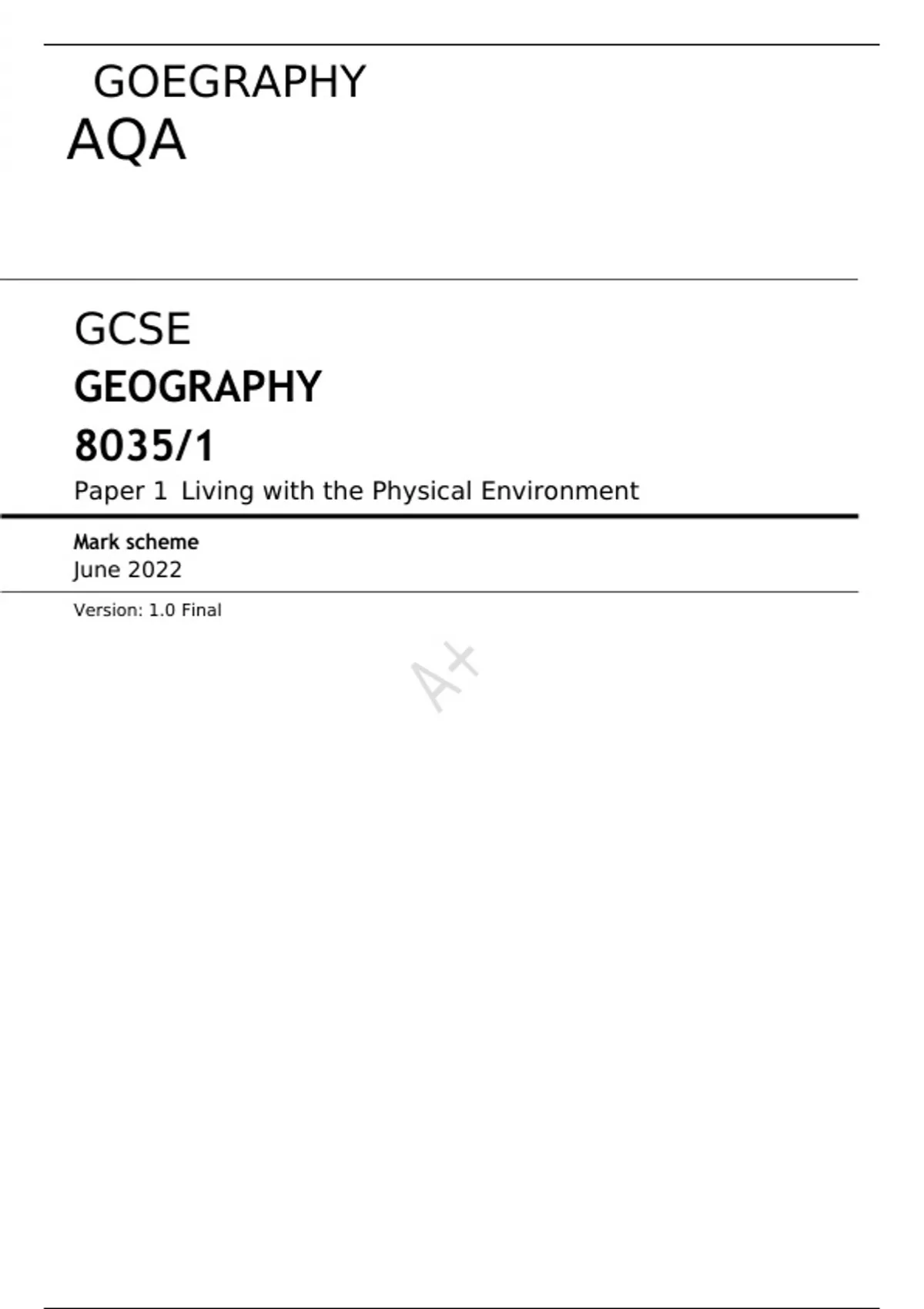 AQA JUNE 2022 GCSE GEOGRAPHY 8035/1 Paper 1 FINAL MARK SCHEME> Living with the Physical Environment