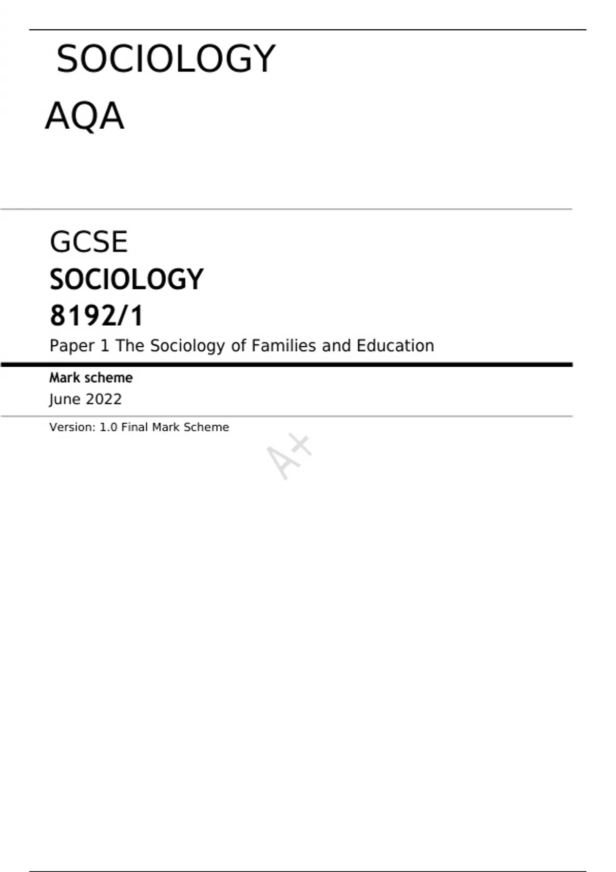 AQA JUNE 2022 GCSE SOCIOLOGY 8192/1 Paper 1 FINAL MARK SCHEME The Sociology of Families and Education