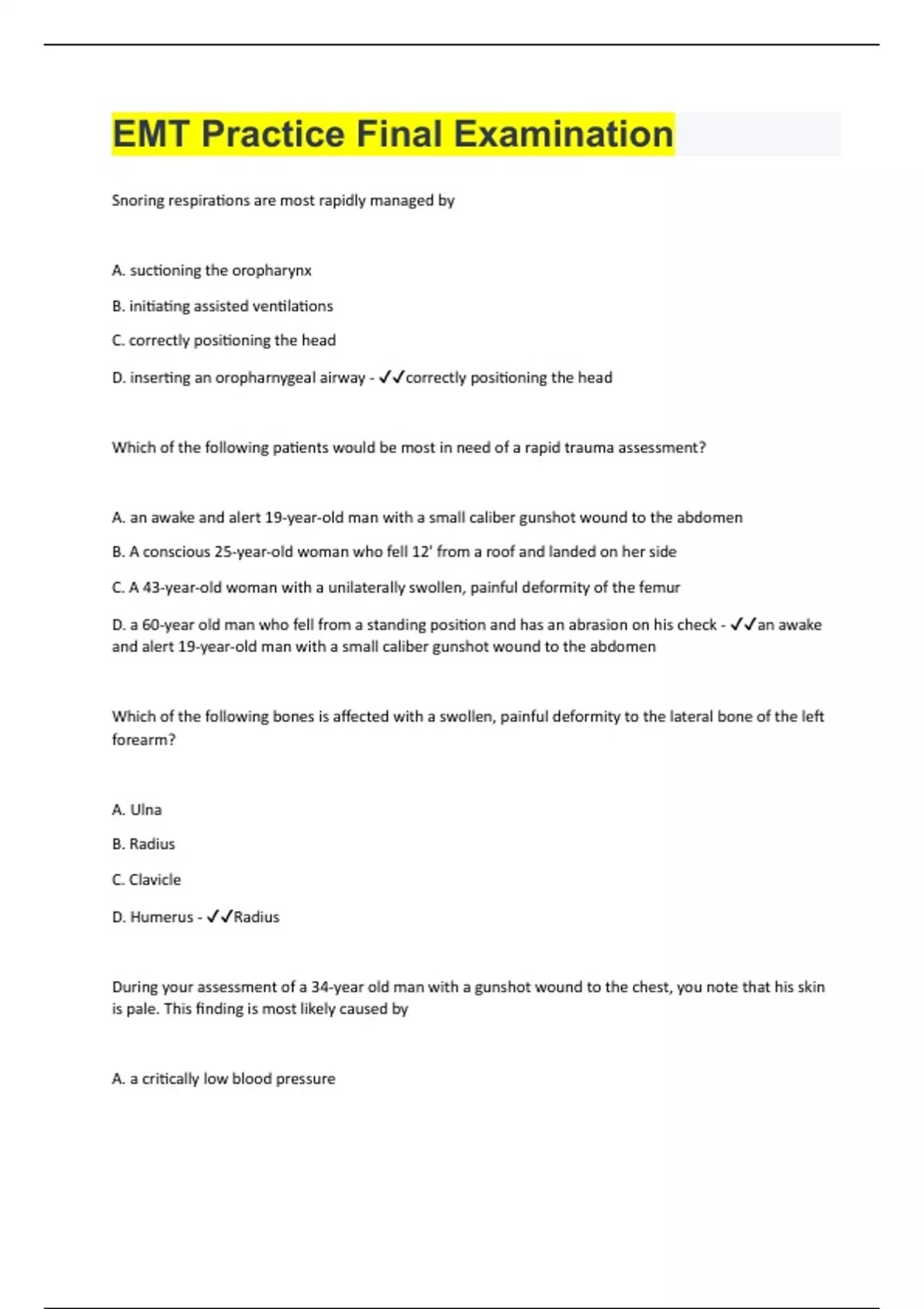 Snoring respirations are most rapidly managed by A. suctioning the oropharynx B. initiating assisted ventilations C. correctly positioning the head D. inserting an oropharnygeal airway - correctly positioning the head Which of the following patients would be most in need of a rapid trauma assessment? A. an awake and alert 19-year-old man with a small caliber gunshot wound to the abdomen B. A conscious 25-year-old woman who fell 12' from a roof and landed on her side C. A 43-year-old woman with a unilaterally swollen, painful deformity of the femur D. a 60-year old man who fell from a standing position and has an abrasion on his check - an awake and alert 19-year-old man with a small caliber gunshot wound to the abdomen Which of the following bones is affected with a swollen, painful deformity to the lateral bone of the left forearm? A. Ulna B. Radius C. Clavicle D. Humerus - Radius During your assessment of a 34-year old man with a gunshot wound to the chest, you note that his skin is pale. This finding is most likely caused by A. a critically low blood pressure