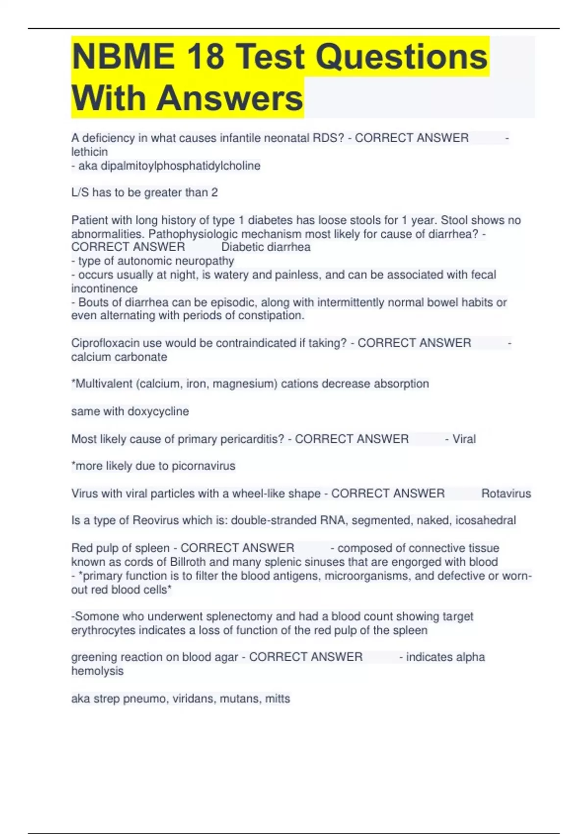 NBME 18 Test Questions With Answers A deficiency in what causes infantile neonatal RDS? - CORRECT ANSWER - lethicin - aka dipalmitoylphosphatidylcholine L/S has to be greater than 2 Patient with long history of type 1 diabetes has loose stools for 1 year. Stool shows no abnormalities. Pathophysiologic mechanism most likely for cause of diarrhea? - CORRECT ANSWER Diabetic diarrhea - type of autonomic neuropathy - occurs usually at night, is watery and painless, and can be associated with fecal incontinence - Bouts of diarrhea can be episodic, along with intermittently normal bowel habits or even alternating with periods of constipation. Ciprofloxacin use would be contraindicated if taking? - CORRECT ANSWER - calcium carbonate *Multivalent (calcium, iron, magnesium) cations decrease absorption same with doxycycline Most likely cause of primary pericarditis? - CORRECT ANSWER - Viral *more likely due to picornavirus Virus with viral particles with a wheel-like shape - CORRECT ANSWER Rotavirus Is a type of Reovirus which is: double-stranded RNA, segmented, naked, icosahedral Red pulp of spleen - CORRECT ANSWER - composed of connective tissue known as cords of Billroth and many splenic sinuses that are engorged with blood - *primary function is to filter the blood antigens, microorganisms, and defective or worn-out red blood cells* -Somone who underwent splenectomy and had a blood count showing target erythrocytes indicates a loss of function of the red pulp of the spleen greening reaction on blood agar - CORRECT ANSWER - indicates alpha hemolysis aka strep pneumo, viridans, mutans, mitts *beta hemolysis is clear on blood agar and gamma shows no hemolysis Indole test is used to differentiate between - CORRECT ANSWER - E. coli and Klebsiella - adding tryptophan to the culture, *E. coli* will split indole from tryptophan but Klebsiella won't E. coli (+)= pink Klebsiella (-)= yellow They are both gram - rods, fast lactose fermenters, and both can cause nosocomial UTIs When giving a drug that causes myelosuppression, it is most appropriate to include monitoring of what? - CORRECT ANSWER - neutrophil count When we talk about drugs that cause bone marrow suppression (Clozapine, Carbamazepine, PTU/Methimazole, Colchicine), we're mostly worried about neutropenia, leading to infections.