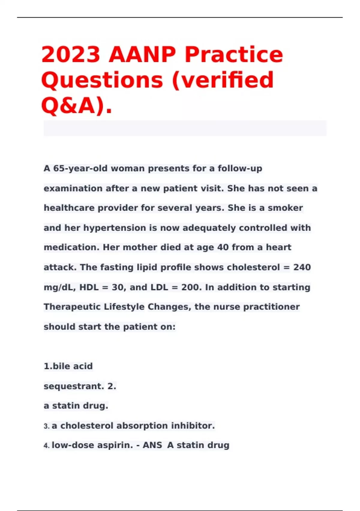 2023 AANP Practice Questions (verified Q&A). 2023 AANP Practice Questions (verified Q&A) A 65-year-old woman presents for a follow-up examination after a new patient visit. She has not seen a healthcare provider for several years. She is a smoker and her hypertension is now adequately controlled with medication. Her mother died at age 40 from a heart attack. The fasting lipid profile shows cholesterol = 240 mg/dL, HDL = 30, and LDL = 200. In addition to starting Therapeutic Lifestyle Changes, the nurse practitioner should start the patient on: acid sequestrant. 2. a statin drug. 3. a cholesterol absorption inhibitor. 4. low-dose aspirin. - ANS A statin drug The most commonly prescribed medication for mild systemic lupus erythematosus (SLE) is: 1. azathioprine (AZA). 2. belimumab (Benlysta). 3. ibuprofen (Advil). 4. cyclophosphamide (Cytoxan). - ANS ibuprofen (advil) The most common sign of cervical cancer is: 1. postcoital bleeding. 2. strong odor from vaginal discharge. 3. itching in the vaginal area. 4. molluscum contagiosum. - ANS postcoital bleeding The nurse practitioner prescribes amitriptyline (Elavil) for a patient with neuropathic pain secondary to diabetes mellitus. On follow-up, the patient complains of urine retention and dry mouth. The practitioner would: 1. discontinue amitriptyline and begin ibuprofen (Motrin). 2. refer to physical therapy. 3. start methocarbamol (Robaxin). 4. discontinue amitriptyline and begin gabapentin (Neurontin). - ANS discontinueamitriptyline and begin gabapentin (neurontin) A 17-year-old male with rheumatoid arthritis is being treated with an NSAID and omeprazole (Prilosec). The patient complains of headache, abdominal pain, and gas. These symptoms are most likely: 1. associated with the omeprazole. 2. related to the underlying condition. 3. the result of the NSAID. 4. caused by viral gastroenteritis. - ANS associated with the omeprazole The medication of choice for the initial treatment of juvenile rheumatoid arthritis is: 1. acetaminophen. 2. prednisone. 3. aspirin. 4. ibuprofen. - ANS ibuprofen A 12-year-old with sickle cell anemia has recently experienced a sickle cell crisis and presents for a follow-up examination after a recent hospitalization. It is most important to continue monitoring growth, development, and: 1. white blood cell levels. 2. fecal occult blood test. 3. hemoglobin levels. 4. urine dipsticks. - ANS hemoglobin levels A 90-year-old female is brought to the clinic by her neighbor. She states that everything is fine, but the nurse practitioner notes that she has poor hygiene and bruises on her trunk. The neighbor is concerned that the patient often has no money to buy food, despite income from social security and a coal miner's pension. The nurse practitioner suspects abuse. Which of the following is the nurse practitioner obligated to do next? 1. Report the case to the proper authorities. 2. Tell the neighbor to check on the woman daily and report back. 3. Document the data and report the information to risk management. 4. Call the patient's family and inquire about the concerns. - ANS report the caseto proper authorities In most cases, the first manifestation of Alzheimer's disease is: 1. impaired judgment. 2. decrease in short-term memory. 3. disorientation in time and place. 4. decrease in long-term memory. - ANS decrease in short-term memoryThe optimal treatment for latent tuberculosis is: 1. rifampin (Rifadin) for 5 months. 2. isoniazid (Nydrazid) for 9 months. 3. pyrazinamide for 6 months. 4. ethambutol for 6 months. - ANS osioniazid (nydrazid) for 9 months Unilateral spontaneous serous or serosanguineous discharge from a single duct of a breast is most often caused by: 1. intraductal papilloma. 2. mucinous breast lesions. 3. Paget's disease. 4. ductal carcinoma in situ. - ANS intraductal papilloma A young child with asthma presents for follow-up evaluation. After numerous changes in medications and doses, the parents report that the child continues to have difficulty with coughing, especially during the night. Which of the following conditions would be the most likely cause of the continued asthma symptoms? 1. Vocal cord dysfunction 2. Cystic fibrosis 3. Gastroesophageal reflux 4. Allergic rhinitis - ANS gastroesophageal reflux A pregnant woman with known HIV infection can reduce the risk of perinatal transmission through zidovudine (Retrovir) therapy. Based on current research, optimal therapy is to start daily dosing: 1. post amniocentesis. 2. after 14 weeks of gestation. 3. if premature rupture of membranes occurs. 4. if maternal viral loads are greater than 10,000. - ANS after 14 weeks gestationT-wave inversion with a normal ST segment on a 12-lead EKG may represent: 1. acute coronary ischemia. 2. right ventricular hypertrophy. 3. atrial hypertrophy. 4. hyperkalemia. - ANS acute coronary ischemia The 16-year-old mother of a 2-month-old presents the infant, reporting that the child is very irritable and does not feed well. During physical examination, the child's head drops back and the child exhibits sudden flexing of the extremities. As the flexing stops, the child cries uncontrollably. Funduscopic examination reveals retinal hemorrhages. Which of the following diagnostic tests should be ordered? 1. Skull X-rays 2. MRI 3. CT scan 4. Pet scan - ANS CT scan The most important diagnostic factor in evaluating angina pectoris is the patient's: 1. King of Heart's monitor. 2. physical examination. 3. history. 4. echocardiogram. - ANS history There are three reasons for latex allergies. Which of the following does NOT cause the problem? 1. Immediate hypersensitivity 2. Irritant contact of dermatitis 3. Cytotoxic hypersensitivity 4. Immune complex reaction - ANS cytotoxic hypersensitivity A patient on warfarin (Coumadin) therapy for recurrent deep vein thrombosis (DVT) is about to have lumbar spinal fusion surgery. The patient's warfarin is put on hold starting 5 days prior to the surgery and subcutaneous Lovenox has been or