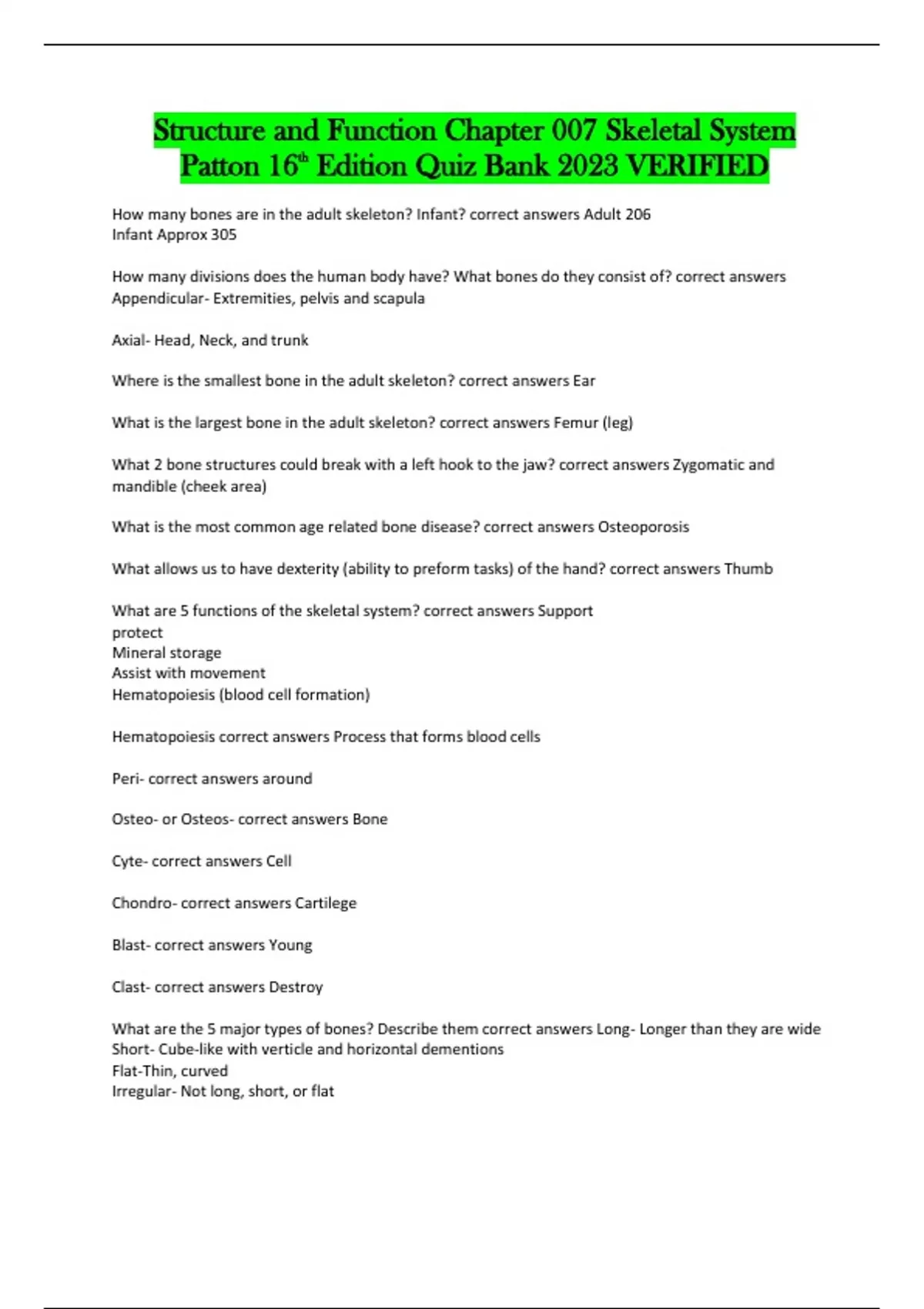 Structure and Function Chapter 007 Skeletal System Patton 16th Edition Quiz Bank 2023 VERIFIED