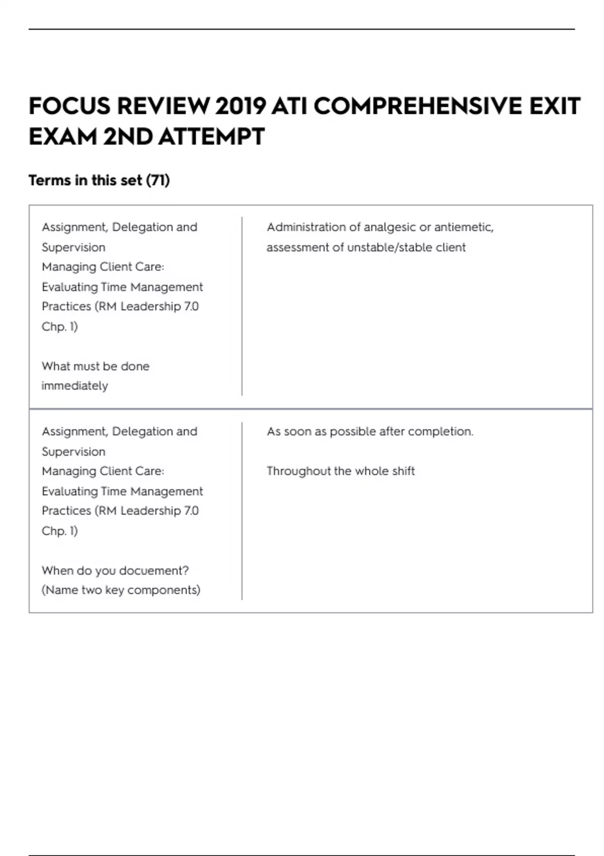 ATI COMPREHENSIVE EXIT EXAM FOCUS REVIEW 2019 ATI COMPREHENSIVE EXIT EXAM 2ND ATTEMPT Assignment, Delegation and Supervision Managing Client Care: Evaluating Time Management Practices (RM Leadership 7.0 Chp. 1) What must be done immediately ANSWER: Administration of analgesic or antiemetic, assessment of unstable/stable client