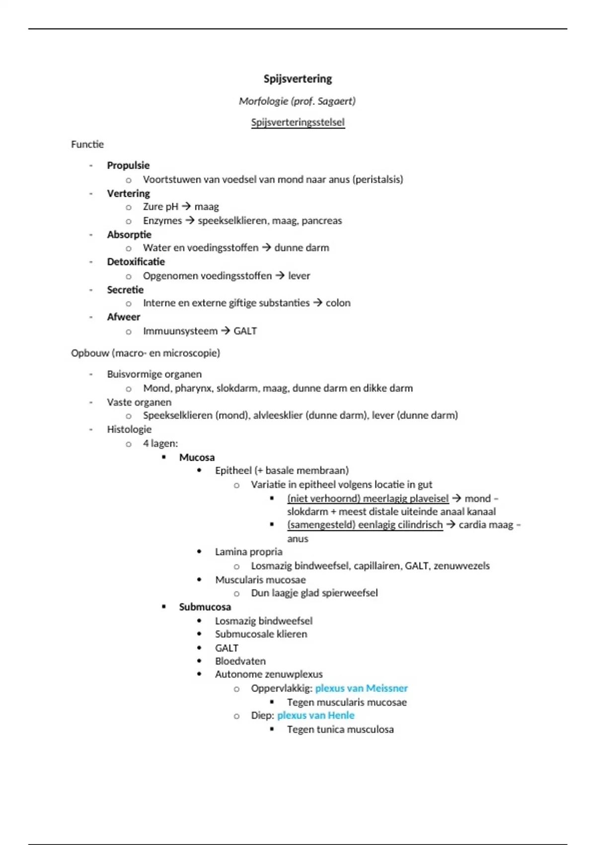 Dit is een uitgebreide samenvatting van het vak Spijsvertering (E03Y7B), morfologie, gegeven door prof. Sagaert. Deze samenvatting bevat alle informatie om hoge punten te halen voor dit onderdeel.