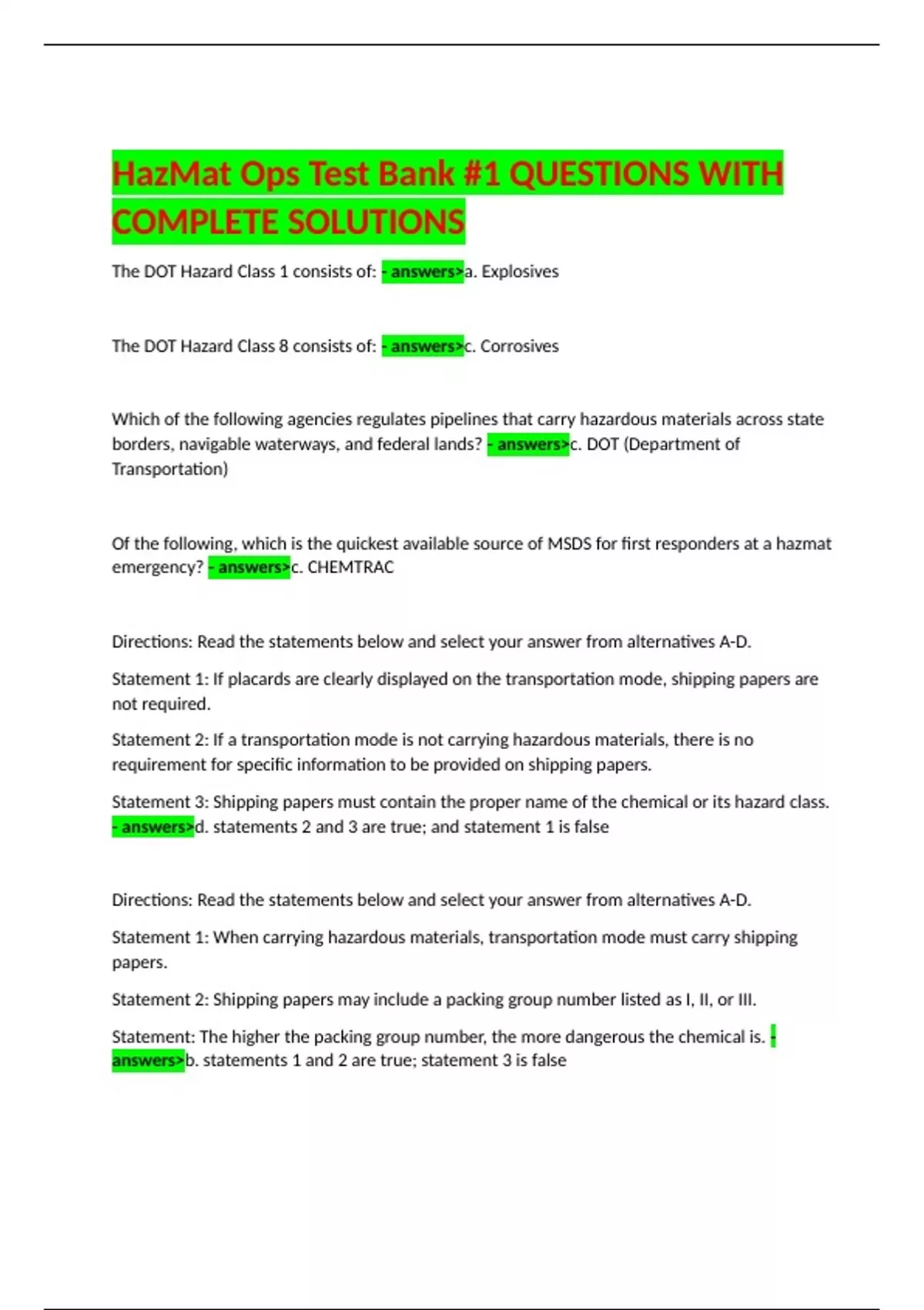 hazmat ops test bank 1 questions with complete solutions