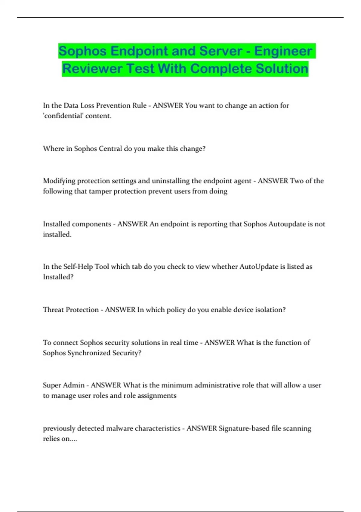 In the Data Loss Prevention Rule CORRECT ANSWER You want to change an action for 'confidential' content. Where in Sophos Central do you make this change? Modifying protection settings and uninstalling the endpoint agent CORRECT ANSWER Two of the following that tamper protection prevent users from doing Installed components CORRECT ANSWER An endpoint is reporting that Sophos Autoupdate is not installed. In the Self-Help Tool which tab do you check to view whether AutoUpdate is listed as Installed? Threat Protection CORRECT ANSWER In which policy do you enable device isolation? To connect Sophos security solutions in real time CORRECT ANSWER What is the function of Sophos Synchronized Security? Super Admin CORRECT ANSWER What is the minimum administrative role that will allow a user to manage user roles and role assignments previously detected malware characteristics CORRECT ANSWER Signature-based file scanning relies on.... Help desk CORRECT ANSWER Minimum administrative role that will allow a user to scan endpoints True CORRECT ANSWER Tamper protection is enabled by default