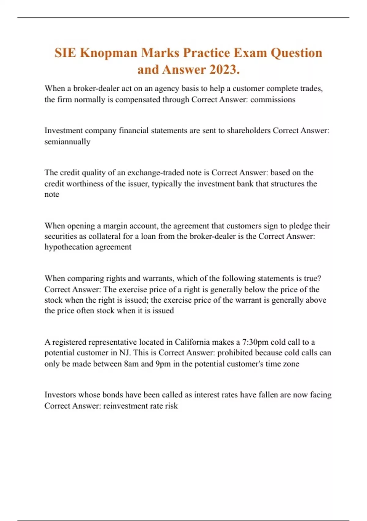 SIE Knopman Marks Practice Exam Question and Answer 2023. When a broker-dealer act on an agency basis to help a customer complete trades, the firm normally is compensated through Correct Answer: commissions Investment company financial statements are sent to shareholders Correct Answer: semiannually The credit quality of an exchange-traded note is Correct Answer: based on the credit worthiness of the issuer, typically the investment bank that structures the note When opening a margin account, the agreement that customers sign to pledge their securities as collateral for a loan from the broker-dealer is the Correct Answer: hypothecation agreement When comparing rights and warrants, which of the following statements is true? Correct Answer: The exercise price of a right is generally below the price of the stock when the right is issued; the exercise price of the warrant is generally above the price often stock when it is issued A registered representative located in California makes a 7:30pm cold call to a potential customer in NJ. This is Correct Answer: prohibited because cold calls can only be made between 8am and 9pm in the potential customer's time zone Investors whose bonds have been called as interest rates have fallen are now facing Correct Answer: reinvestment rate risk Helen opened a Roth IRA last year and wants to know what part of this year's contributions she can deduct. The answer is Correct Answer: she can't deduct any amount During the accumulation phase of a variable annuity, dividends, interest, and capital gains Correct Answer: may be reinvested without any current tax liability Dollar limits on a 529 plan contributions per beneficiary are set by Correct Answer: various states With regard to the price of closed-end fund shares held by investors which of the following statements is TRUE? Correct Answer: Shares may be sold at a discount or premium to their NAV A customer requests in writing that his account statements be held by the firm while he spends the winter in Florida. In response to the customer's request, the firm is permitted to honor the request Correct Answer: for a maximum of three months Which of the following is not an example of a restricted person under FINRA rules? Correct Answer: The uncle of a restricted person The order of liquidation in a limited partnership Correct Answer: secured bondholder, unsecured bondholder, limited partner, general partner All of the following sectors are considered cyclical EXCEPT Correct Answer: healthcare Which of the following interest rates is established by the Federal Reserve Board? Correct Answer: discount rate Pursuant to Regulation S-P, a broker-dealer must provide a privacy notice to a customer Correct Answer: prior to engaging in any securities business with that customer Which of the following events would subject an individual to a statutory disqualification Correct Answer: a conviction for a securities related misdemeanor 9 years ago Noreen and her husband Jeff, residents of New York City, have just had their first child Ali. They are interested in opening a 529 Plan for Ali in order to save for her future college education. As a registered representative, it would be most appropriate to tell them Correct Answer: to invest in a NY state 529 as there may be certain tax advantages at the state level Which of the following regulators enforce the MSRB rules for securities firms? Correct Answer: FINRA