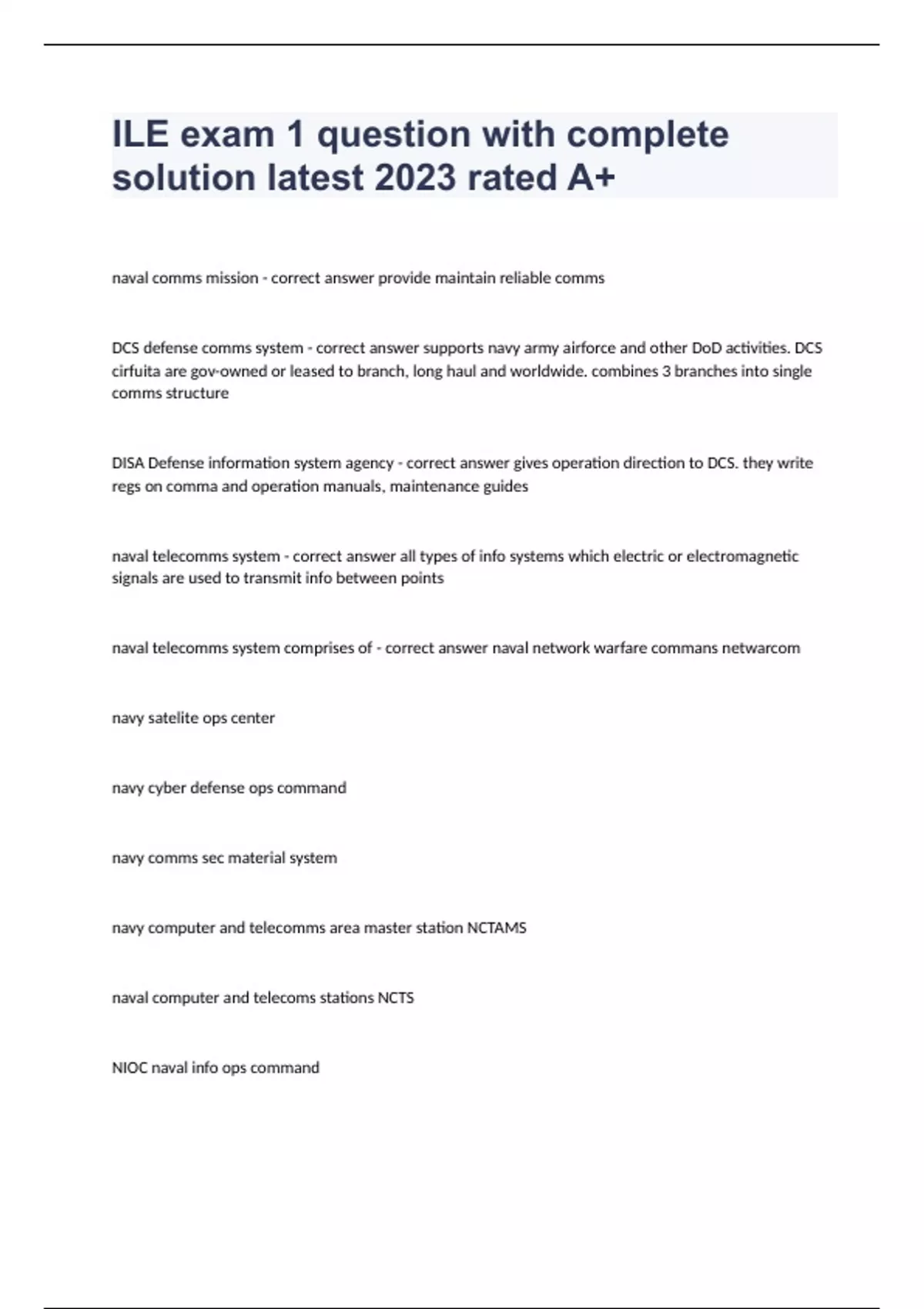 ILE exam 1 question with complete solution latest 2023 rated A+naval comms mission - correct answer provide maintain reliable comms DCS defense comms system - correct answer supports navy army airforce and other DoD activities. DCS cirfuita are gov-owned or leased to branch, long haul and worldwide. combines 3 branches into single comms structure DISA Defense information system agency - correct answer gives operation direction to DCS. they write regs on comma and operation manuals, maintenance guides naval telecomms system - correct answer all types of info systems which electric or electromagnetic signals are used to transmit info between points naval telecomms system comprises of - correct answer naval network warfare commans netwarcom navy satelite ops center navy cyber defense ops command navy comms sec material system navy computer and telecomms area master station NCTAMS naval computer and telecoms stations NCTS NIOC naval info ops command