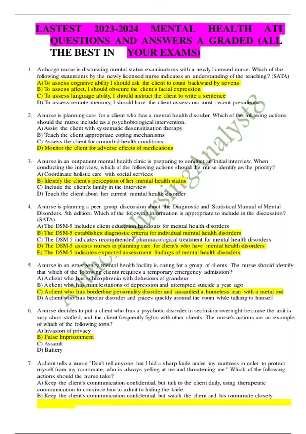 LASTEST MENTAL HEALTH ATI QUESTIONS AND ANSWERS A GRADED (ALL THE BEST IN YOUR EXAMS)