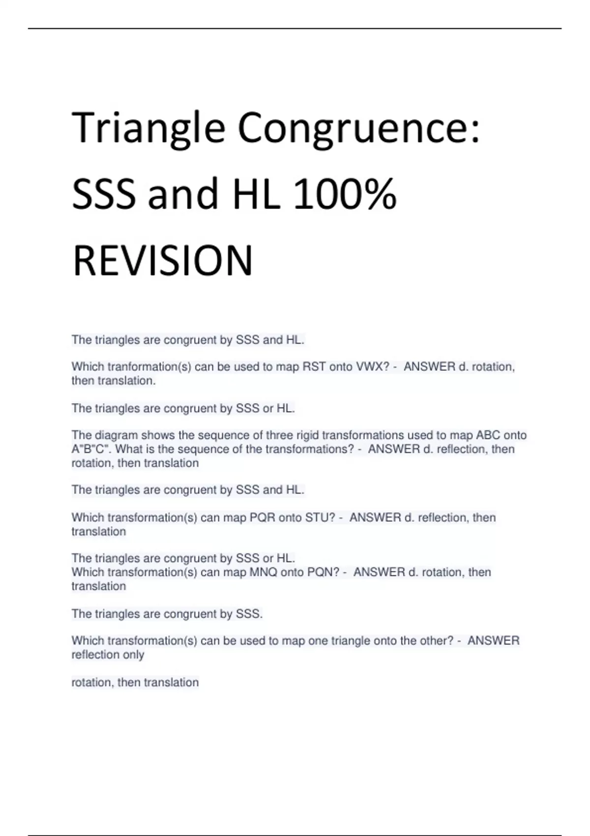Triangle Congruence: SSS and HL 100% REVISION The triangles are congruent by SSS and HL. Which tranformation(s) can be used to map RST onto VWX? - ANSWER d. rotation, then translation. The triangles are congruent by SSS or HL. The diagram shows the sequence of three rigid transformations used to map ABC onto A"B"C". What is the sequence of the transformations? - ANSWER d. reflection, then rotation, then translation The triangles are congruent by SSS and HL. Which transformation(s) can map PQR onto STU? - ANSWER d. reflection, then translation The triangles are congruent by SSS or HL. Which transformation(s) can map MNQ onto PQN? - ANSWER d. rotation, then translation The triangles are congruent by SSS. Which transformation(s) can be used to map one triangle onto the other? - ANSWER reflection only rotation, then translation