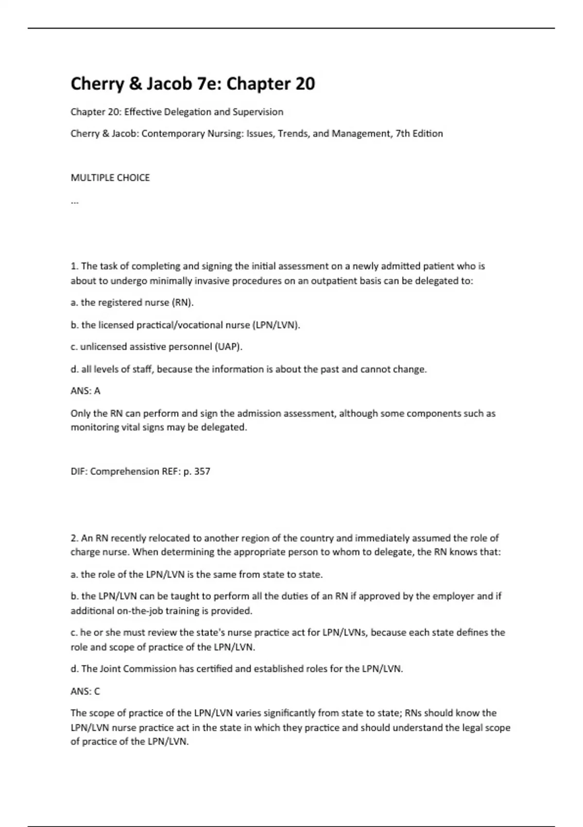 Chapter 20: Effective Delegation and Supervision Cherry & Jacob: Contemporary Nursing: Issues, Trends, and Management, 7th Edition MULTIPLE CHOICE ... 1. The task of completing and signing the initial assessment on a newly admitted patient who is about to undergo minimally invasive procedures on an outpatient basis can be delegated to: a. the registered nurse (RN). b. the licensed practical/vocational nurse (LPN/LVN). c. unlicensed assistive personnel (UAP). d. all levels of staff, because the information is about the past and cannot change. ANS: A Only the RN can perform and sign the admission assessment, although some components such as monitoring vital signs may be delegated.