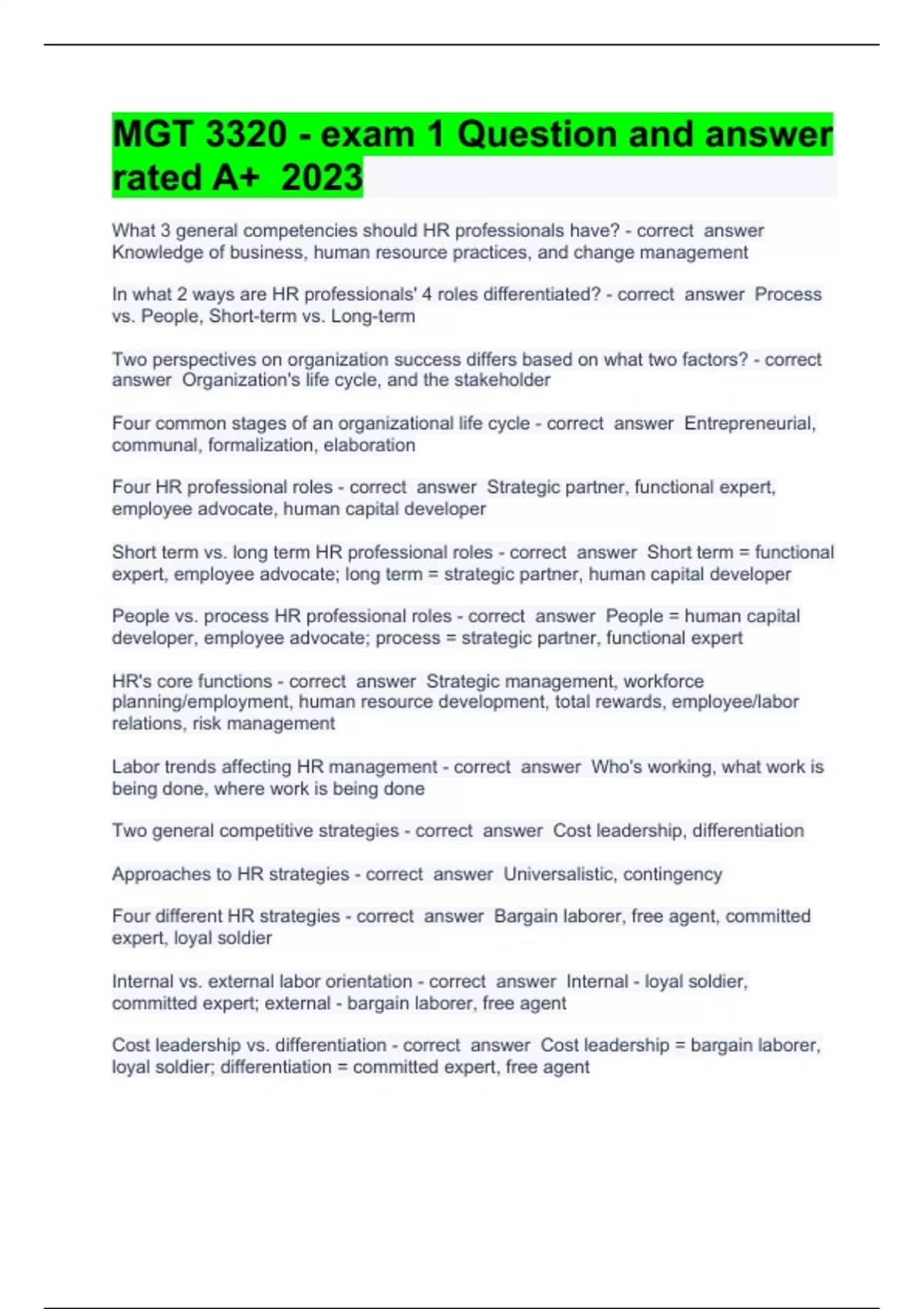 MGT 3320 - exam 1 Question and answer rated A+ 2023What 3 general competencies should HR professionals have? Knowledge of business, human resource practices, and change management In what 2 ways are HR professionals' 4 roles differentiated? Process vs. People, Short-term vs. Long-term Two perspectives on organization success differs based on what two factors? Organization's life cycle, and the stakeholder Four common stages of an organizational life cycle Entrepreneurial, communal, formalization, elaboration Four HR professional roles Strategic partner, functional expert, employee advocate, human capital developer Short term vs. long term HR professional roles Short term = functional expert, employee advocate; long term = strategic partner, human capital developer People vs. process HR professional roles People = human capital developer, employee advocate; process = strategic partner, functional expert HR's core functions Strategic management, workforce planning/employment, human resource development, total rewards, employee/labor relations, risk management Labor trends affecting HR management Who's working, what work is being done, where work is being done Two general competitive strategies Cost leadership, differentiation Approaches to HR strategies Universalistic, contingency Four different HR strategies Bargain laborer, free agent, committed expert, loyal soldier Internal vs. external labor orientation Internal - loyal soldier, committed expert; external - bargain laborer, free agent Cost leadership vs. differentiation Cost leadership = bargain laborer, loyal soldier; differentiation = committed expert, free agent