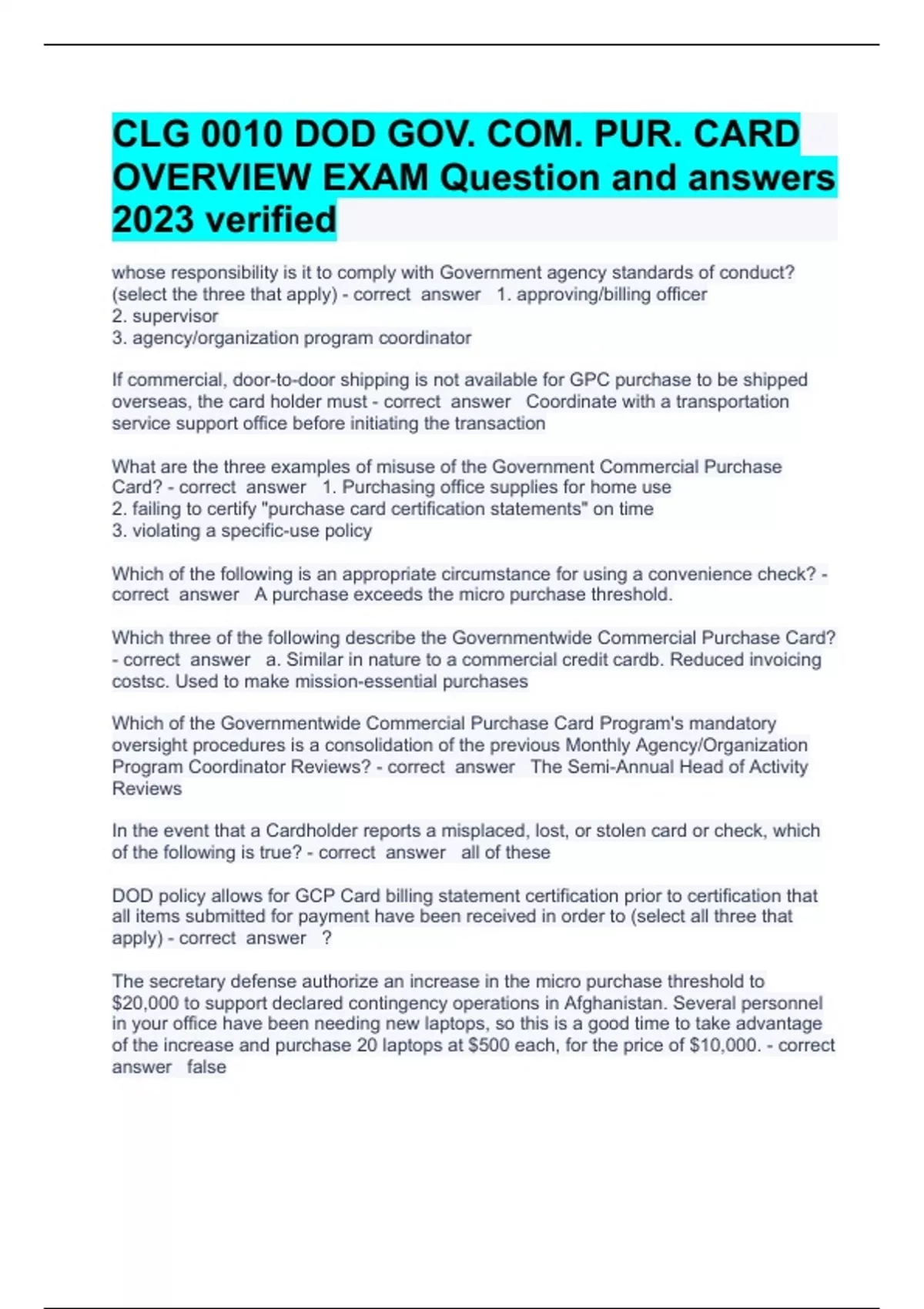 CLG 0010 DOD GOV. COM. PUR. CARD OVERVIEW EXAM Question and answers 2023 verified whose responsibility is it to comply with Government agency standards of conduct? (select the three that apply) 1. approving/billing officer 2. supervisor 3. agency/organization program coordinator If commercial, door-to-door shipping is not available for GPC purchase to be shipped overseas, the card holder must Coordinate with a transportation service support office before initiating the transaction What are the three examples of misuse of the Government Commercial Purchase Card? 1. Purchasing office supplies for home use 2. failing to certify "purchase card certification statements" on time 3. violating a specific-use policy Which of the following is an appropriate circumstance for using a convenience check? A purchase exceeds the micro purchase threshold. Which three of the following describe the Governmentwide Commercial Purchase Card? a. Similar in nature to a commercial credit cardb. Reduced invoicing costsc. Used to make mission-essential purchases Which of the Governmentwide Commercial Purchase Card Program's mandatory oversight procedures is a consolidation of the previous Monthly Agency/Organization Program Coordinator Reviews? The Semi-Annual Head of Activity Reviews In the event that a Cardholder reports a misplaced, lost, or stolen card or check, which of the following is true? all of these