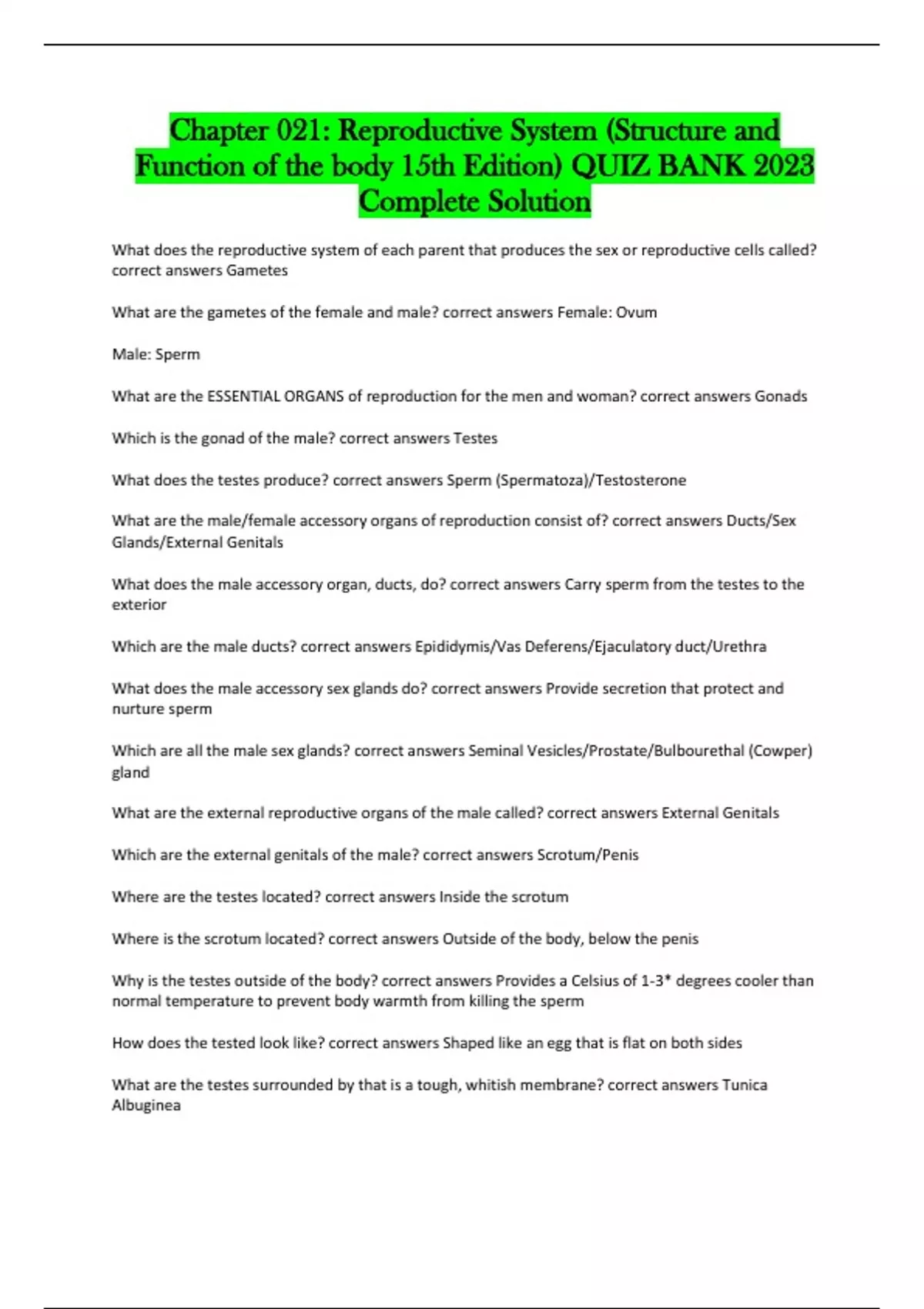 Chapter 021: Reproductive System (Structure and Function of the body 15th Edition) QUIZ BANK 2023 Complete Solution
