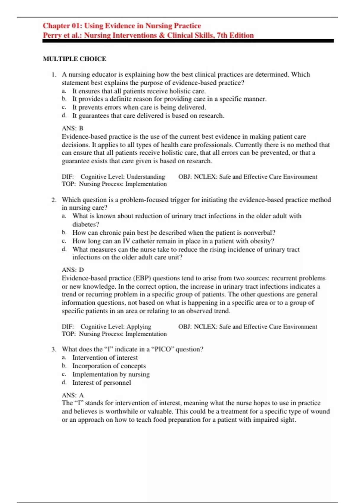 1. A nursing educator is explaining how the best clinical practices are determined. Which statement best explains the purpose of evidence-based practice? a. It ensures that all patients receive holistic care. b. It provides a definite reason for providing care in a specific manner. c. It prevents errors when care is being delivered. d. It guarantees that care delivered is based on research. ANS: B Evidence-based practice is the use of the current best evidence in making patient care decisions. It applies to all types of health care professionals. Currently there is no method that can ensure that all patients receive holistic care, that all errors can be prevented, or that a guarantee exists that care given is based on research. DIF: Cognitive Level: Understanding OBJ: NCLEX: Safe and Effective Care Environment TOP: Nursing Process: Implementation