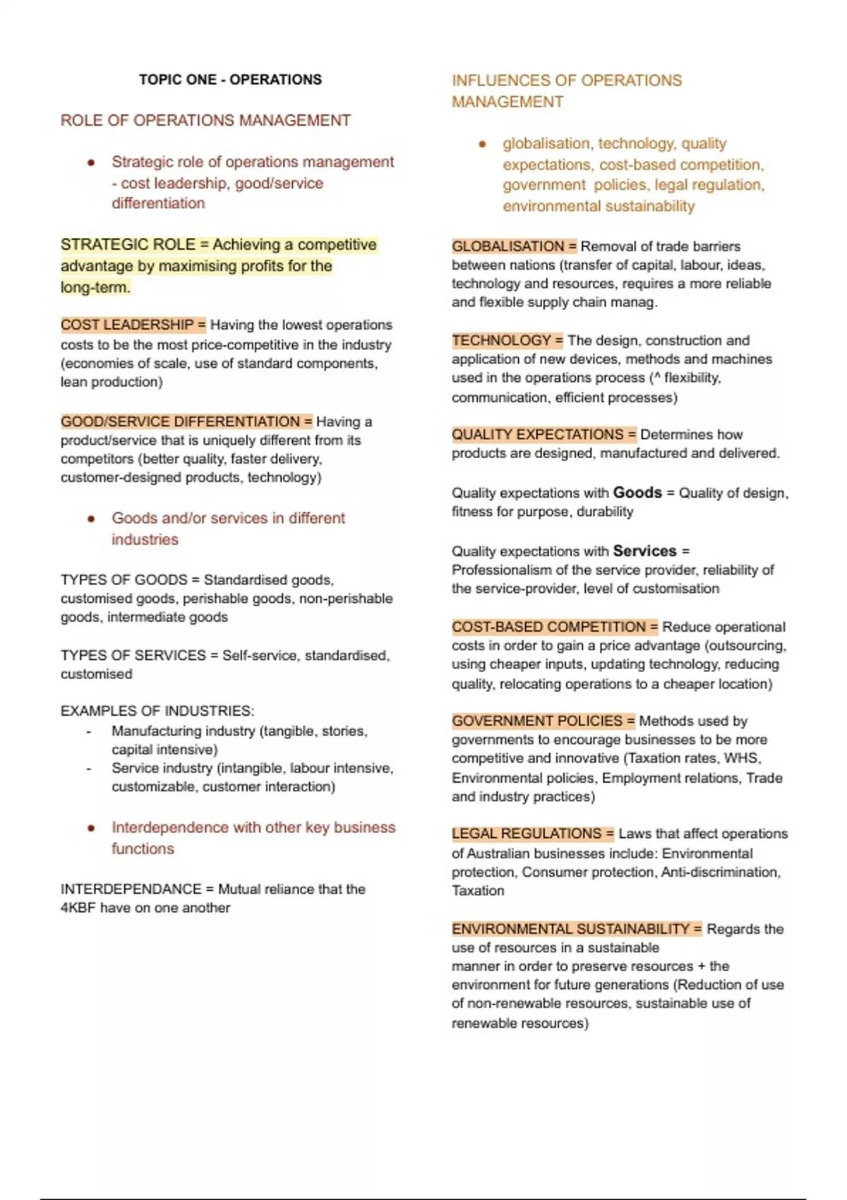 TOPIC ONE - OPERATIONS ROLE OF OPERATIONS MANAGEMENT ● Strategic role of operations management - cost leadership, good/service differentiation STRATEGIC ROLE = Achieving a competitive advantage by maximising profits for the long-term. COST LEADERSHIP = Having the lowest operations costs to be the most price-competitive in the industry (economies of scale, use of standard components, lean production) GOOD/SERVICE DIFFERENTIATION = Having a product/service that is uniquely different from its competitors (better quality, faster delivery, customer-designed products, technology) ● Goods and/or services in different industries TYPES OF GOODS = Standardised goods, customised goods, perishable goods, non-perishable goods, intermediate goods TYPES OF SERVICES = Self-service, standardised, customised EXAMPLES OF INDUSTRIES: - Manufacturing industry (tangible, stories, capital intensive) - Service industry (intangible, labour intensive, customizable, customer interaction) ● Interdependence with other key business functions INTERDEPENDANCE = Mutual reliance that the 4KBF have on one another INFLUENCES OF OPERATIONS MANAGEMENT ● globalisation, technology, quality expectations, cost-based competition, government policies, legal regulation, environmental sustainability GLOBALISATION = Removal of trade barriers between nations (transfer of capital, labour, ideas, technology and resources, requires a more reliable and flexible supply chain manag. TECHNOLOGY = The design, construction and application of new devices, methods and machines used in the operations process (^ flexibility, communication, efficient processes) QUALITY EXPECTATIONS = Determines how products are designed, manufactured and delivered. Quality expectations with Goods = Quality of design, fitness for purpose, durability Quality expectations with Services = Professionalism of the service provider, reliability of the service-provider, level of customisation COST-BASED COMPETITION = Reduce operational costs in order to gain a price advantage (outsourcing, using cheaper inputs, updating technology, reducing quality, relocating operations to a cheaper location) GOVERNMENT POLICIES = Methods used by governments to encourage businesses to be more competitive and innovative (Taxation rates, WHS, Environmental policies, Employment relations, Trade and industry practices) LEGAL REGULATIONS = Laws that affect operations of Australian businesses include: Environmental protection, Consumer protection, Anti-discrimination, Taxation ENVIRONMENTAL SUSTAINABILITY = Regards the use of resources in a sustainable manner in order to preserve resources + the environment for future generations (Reduction of use of non-renewable resources, sustainable use of renewable resources)