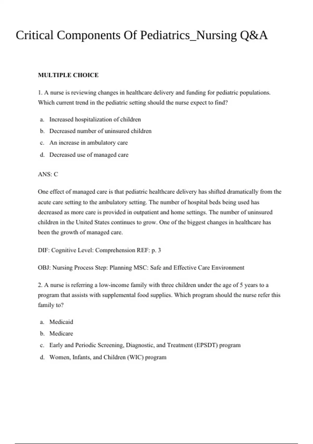 Critical Components Of Pediatrics_Nursing Q&A. 1. A nurse is reviewing changes in healthcare delivery and funding for pediatric populations. Which current trend in the pediatric setting should the nurse expect to find? a. Increased hospitalization of children b. Decreased number of uninsured children c. An increase in ambulatory care d. Decreased use of managed care ANS: C One effect of managed care is that pediatric healthcare delivery has shifted dramatically from the acute care setting to the ambulatory setting. The number of hospital beds being used has decreased as more care is provided in outpatient and home settings. The number of uninsured children in the United States continues to grow. One of the biggest changes in healthcare has been the growth of managed care. DIF: Cognitive Level: Comprehension REF: p. 3 OBJ: Nursing Process Step: Planning MSC: Safe and Effective Care Environment 2. A nurse is referring a low-income family with three children under the age of 5 years to a program that assists with supplemental food supplies. Which program should the nurse refer this family to? a. Medicaid b. Medicare c. Early and Periodic Screening, Diagnostic, and Treatment (EPSDT) program d. Women, Infants, and Children (WIC) program ANS: D WIC is a federal program that provides supplemental food supplies to low-income women who are pregnant or breast-feeding and to their children until the age of 5 years. Medicaid and the Medicaid Early and Periodic Screening, Diagnostic, and Treatment (EPSDT) program provides for well-child examinations and related treatment of medical problems. Children in the WIC program are often referred for immunizations, but that is not the primary focus of the program. Public Law 99-457 provides financial incentives to states to establish comprehensive early intervention services for infants and toddlers with, or at risk for, developmental disabilities. Medicare is the program for Senior Citizens. DIF: Cognitive Level: Application REF: p. 7 OBJ: Nursing Process Step: Implementation MSC: Health Promotion and Maintenance 3. In most states, adolescents who are not emancipated minors must have parental permission before: a. treatment for drug abuse. b. treatment for sexually transmitted diseases (STDs). c. obtaining birth control. d. surgery. ANS: D An emancipated minor is a minor child who has the legal competence of an adult. Legal counsel may be consulted to verify the status of the emancipated minor for consent purposes. Most states allow minors to obtain treatment for drug or alcohol abuse and STDs and allow access to birth control without parental consent. DIF: Cognitive Level: Application REF: p. 12 OBJ: Nursing Process Step: Planning MSC: Safe and Effective Care Environment 4. A nurse is completing a clinical pathway for a child admitted to the hospital with pneumonia. Which characteristic of a clinical pathway is correct? a. Developed and implemented by nurses b. Used primarily in the pediatric setting c. Specific time lines for sequencing interventions d. One of the steps in the nursing process ANS: C Clinical pathways measure outcomes of client care and are developed by multiple healthcare professionals. Each pathway outlines specific time lines for sequencing interventions and reflects interdisciplinary interventions. Clinical pathways are used in multiple settings and for clients throughout the life span. The steps of the nursing process are assessment, diagnosis, planning, implementation, and evaluation. DIF: Cognitive Level: Comprehension REF: p. 6 OBJ: Nursing Process Step: Planning MSC: Safe and Effective Care Environment 5. When planning a parenting class, the nurse should explain that the leading cause of death in children 1 to 4 years of age in the United States is: a. premature birth. b. congenital anomalies. c. accidental death. d. respiratory tract illness. ANS: C Accidents are the leading cause of death in children ages 1 to 19 years. Disorders of short gestation and unspecified low birth weight make up one of the leading causes of death in neonates. One of the leading causes of infant death after the first month of life is congenital anomalies. Respiratory tract illnesses are a major cause of morbidity in children. DIF: Cognitive Level: Application REF: p. 9 OBJ: Nursing Process Step: Implementation MSC: Safe and Effective Care Environment 6. Which statement is true regarding the quality assurance or incident report? a. The report assures the legal department that there is no problem. b. Reports are a permanent part of the clients chart. c. The nurses notes should contain the following: Incident report filed and copy placed in chart. d. This report is a form of documentation of an event that may result in legal action. ANS: D An incident report is a warning to the legal department to be prepared for potential legal action; it is not a part of the clients chart or nurse documentation. DIF: Cognitive Level: Knowledge REF: p. 14 OBJ: Nursing Process Step: Implementation MSC: Safe and Effective Care Environment 7. Which client situation fails to meet the first requirement of informed consent? a. The parent does not understand the physicians explanations. b. The physician gives the parent only a partial list of possible side effects and complications. c. No parent is available and the physician asks the adolescent to sign the consent form. d. The infants teenage mother signs a consent form because her parent tells her to. ANS: C The first requirement of informed consent is that the person giving consent must be competent. Minors are not allowed to give consent. An understanding of information, full disclosure, and voluntary consent are requirements of informed consent, but none of these is the first requirement. DIF: Cognitive Level: Comprehension REF: p. 12 OBJ: Nursing Process Step: Implementation MSC: Safe and Effective Care Environment 8. A nurse assigned to a child does not know how to perform a treatment that has been prescribed for the child