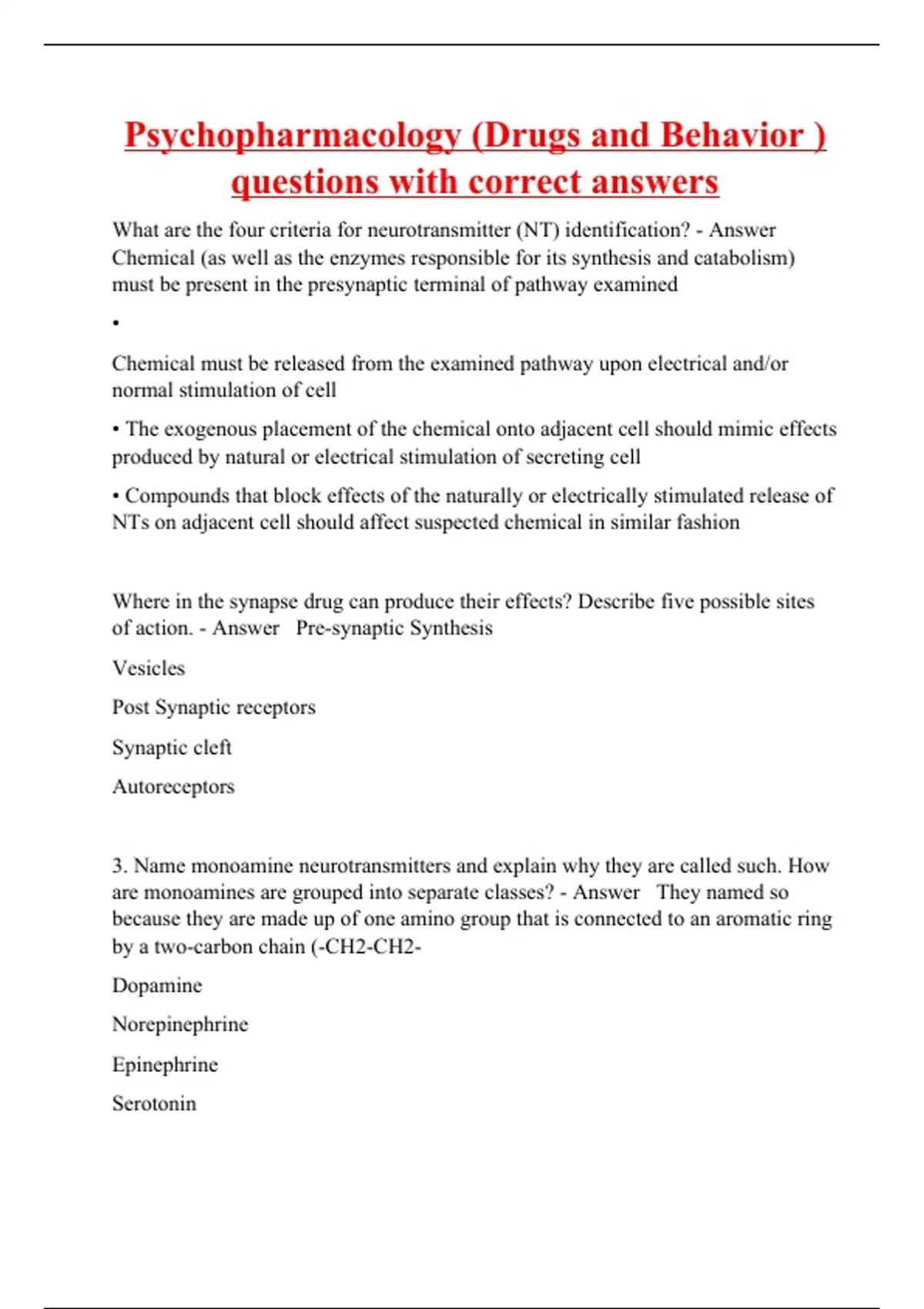 What are the four criteria for neurotransmitter (NT) identification? - Answer Chemical (as well as the enzymes responsible for its synthesis and catabolism) must be present in the presynaptic terminal of pathway examined • Chemical must be released from the examined pathway upon electrical and/or normal stimulation of cell • The exogenous placement of the chemical onto adjacent cell should mimic effects produced by natural or electrical stimulation of secreting cell • Compounds that block effects of the naturally or electrically stimulated release of NTs on adjacent cell should affect suspected chemical in similar fashion Where in the synapse drug can produce their effects? Describe five possible sites of action. - Answer Pre-synaptic Synthesis Vesicles Post Synaptic receptors Synaptic cleft Autoreceptors 3. Name monoamine neurotransmitters and explain why they are called such. How are monoamines are grouped into separate classes? - Answer They named so because they are made up of one amino group that is connected to an aromatic ring by a two-carbon chain (-CH2-CH2- Dopamine