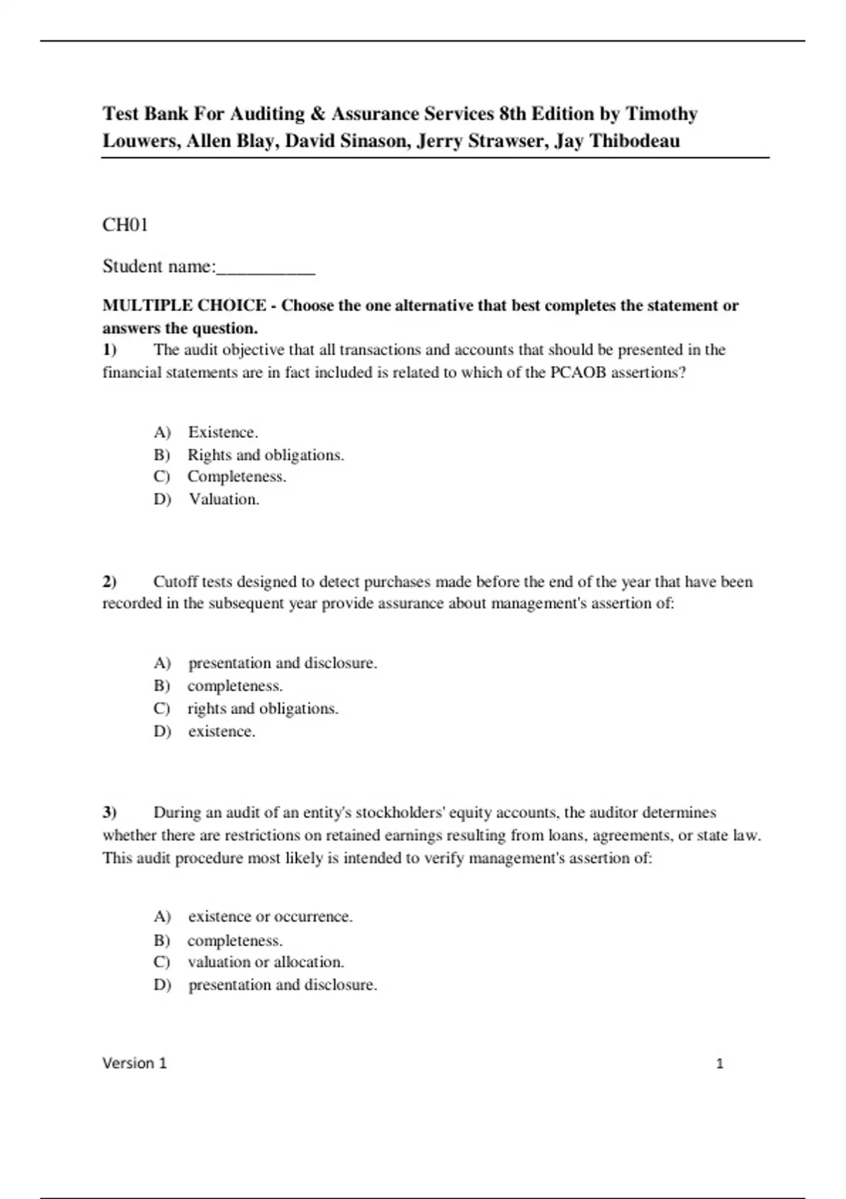 Test Bank For Auditing & Assurance Services 8th Edition by Timothy Louwers, Allen Blay, David Sinason, Jerry Strawser, Jay Thibodeau