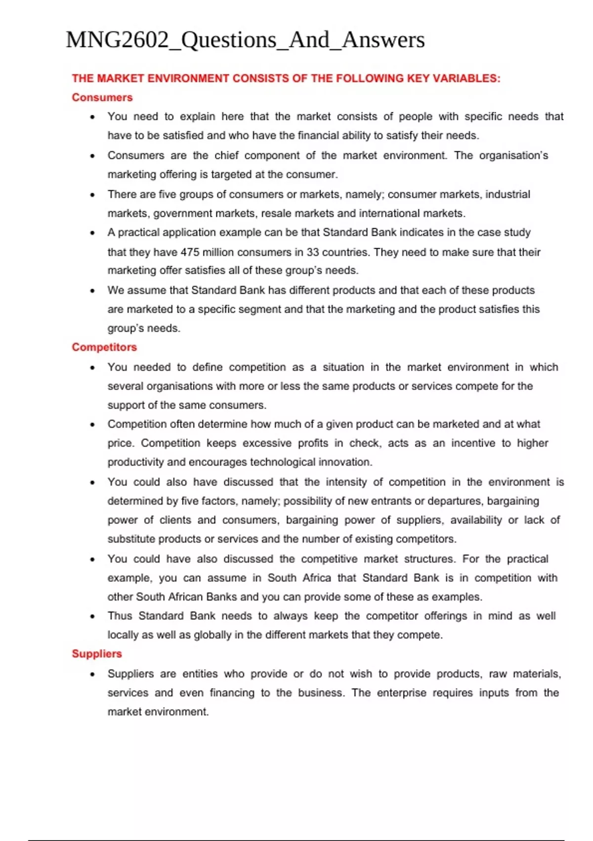MNG2602_Questions_And_Answers. Question1 Acceptable organizational political action includes all of the following, expect……… 1. the use of power for the achievement of organizational goals 2. actions to obtain dominance over others 3. the use of influence to protect the interests of one’s group (such as a department) 4. negotiation and coalition forming Question2 A low ranking individual can probably influence the behaviour or beliefs of others by using …… 1. an informal social network 2. the formal hierarchy 3. vertical downward communication 4. negotiation and coalition building Question 3 The potential to influence behaviour, to change the cause of events to overcome resistance and to get people to do things they would not otherwise do defines ………… 1. individual interest 2. collective interest 3. power 4. politics Question 4 The bases for collective interests in organizations include all of the following, expect ………. 1. individuals acting in their own interests 2. demographic groups defined by factors such as age and gender 3. professions represented in an organization 4. division of labour such as full time and part time workers Question 5 Identify the incorrect statement 1. conflict is seldom present in well managed organizations 2. conflict is the result of individuals and groups completing for the same scarce resources 3. organograms provide some clues as to why people engage in political action in order to advance in their careers 4. the fewer positions available higher up in the organization, the more conflict that will develop between competing individuals Question 6 Sources of power derive from all of the following, except …….. 1. organisational hierarchy 2. coercion 3. control over resources 4. conflict between groups Question 7 A scientist with superior knowledge about complicated scientific processes working for an organidation developing cutting edge solutions to complex scientific problems processes refers to ….. power. 1. referent 2. expert 3. legitimate 4. reward Question 8 Which one of the following is not a source of power? 1. using symbolism and the management of meaning to further one’s own interests 2. having control over knowledge and information 3. having an excellent past track record 4. being a good team player Question 9 The influence that stems from individual social networks is extremely powerful in …….. 1. bureaucratic organizations 2. organizations with flat structures 3. organizations where authority is centralized 4. organizations with tall structures Question 10 …………. determines the power obtained by an individual through his or her social network. 1. the size of his or her network 2. the number of contracts between the person and important decision makers 3. the efficiency of his or her network 4. all the variables listed in alternatives 1, 2 and 3 are correct. Question 11 …….. can be defined as a management tool used to plan, organize, implement and control activities in order to attain a predefined objective. 1. a single use plan 2. project management 3. a programme 4. budgeting Question 12 Project management thus has four important elements, namely ….. 1. cost, time, quality and risk 2. planning, organizing, leading and control 3. standardizing, control, budgeting and management 4. negotiation, end user involvement, planning and coordination Question 13 To be able to manage a certain project, which of the following resources are necessary? a) human resources b) money c) equipment d) machinery e) information systems f) time 1. a, b and d 2. a, b, c and d 3. b, d, e and f 4. all of the options Question 14 Which one of the following is not an advantage of project management? 1. effective project management may lead to a shorter competition period 2. the costs of some of the activities of the project can be controlled 3. effective project management can improve the quality of the product or service 4. the involvement of role players may improve transparency Question 15 Identify the incorrect statement: 1. At strategic level, top managers consider the organisation’s internal environment in order to formulate the overall direction of the organization 2. At tactical level, middle managers translate the direction of the organization into initiatives which will later become different projects 3. At operational level, line managers play the role of project managers who are responsible for the actual planning, execution and control of a project 4. None of the above Question 16 The following key role player in project management analyses the internal and external environments of the organization 1. the operational manager 2. the tactical manager 3. the client 4. the strategic manager Question 17 The project centre is responsible for …….. 1. managing the project’s budget 2. monitoring the project’s progress 3. informing the client of the outcome of the project 4. rewarding project members Question 18 The …….. translates the strategic priorities and goals (as formulated by the strategic manager) of the organization into potential programmes, consisting of various projects. 1. strategic manager 2. client 3. financial manager 4. tactical manager Question 19 Which of the following are examples of formal methods for determining the need for a project? a) questionnaires b) scientific surveys c) opinion polls d) debates at community committees e) discussions f) observations 1. a and b