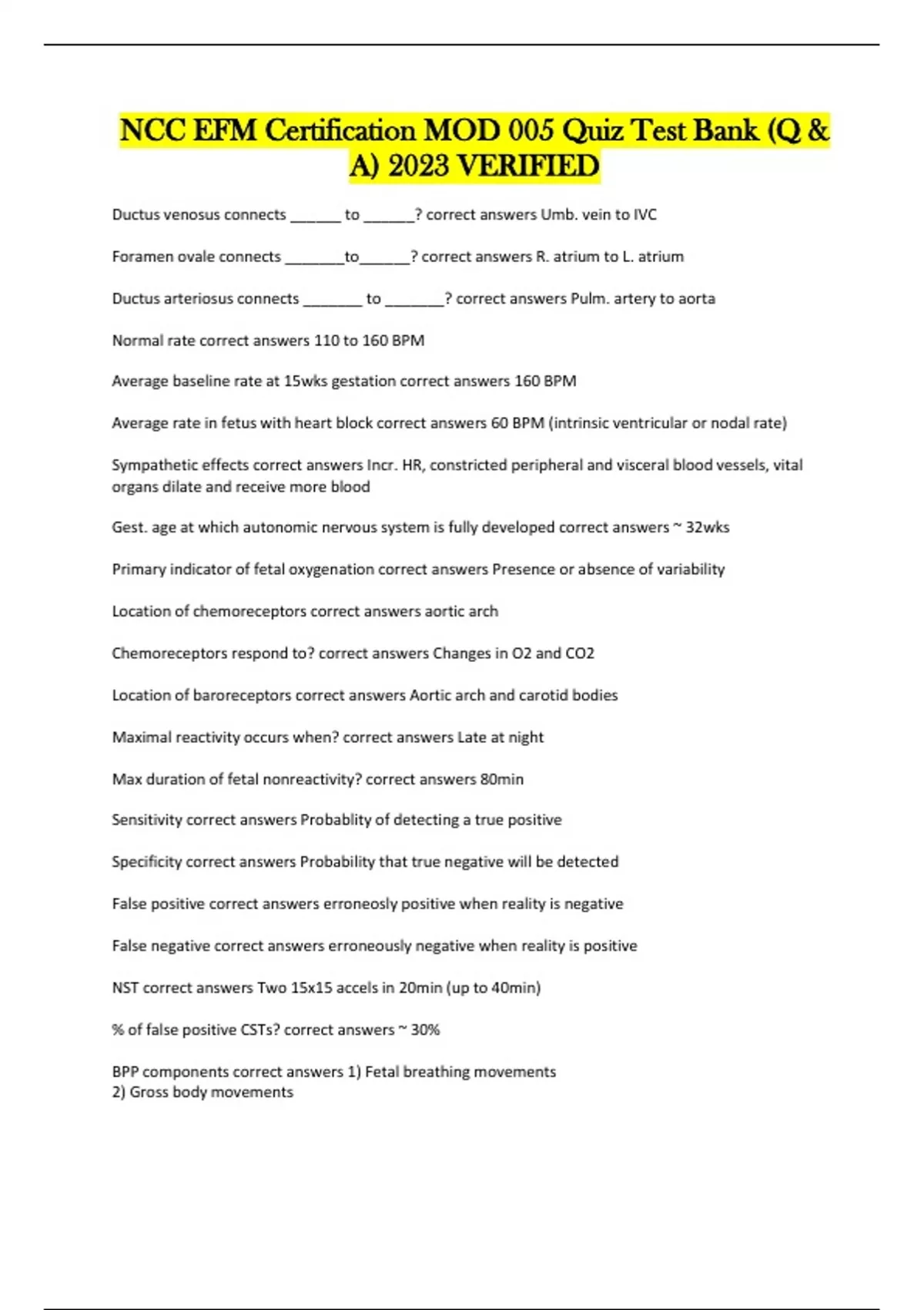 Ductus venosus connects ______ to ______? correct answers Umb. vein to IVC Foramen ovale connects _______to______? correct answers R. atrium to L. atrium Ductus arteriosus connects _______ to _______? correct answers Pulm. artery to aorta Normal rate correct answers 110 to 160 BPM Average baseline rate at 15wks gestation correct answers 160 BPM Average rate in fetus with heart block correct answers 60 BPM (intrinsic ventricular or nodal rate) Sympathetic effects correct answers Incr. HR, constricted peripheral and visceral blood vessels, vital organs dilate and receive more blood Gest. age at which autonomic nervous system is fully developed correct answers ~ 32wks Primary indicator of fetal oxygenation correct answers Presence or absence of variability Location of chemoreceptors correct answers aortic arch Chemoreceptors respond to? correct answers Changes in O2 and CO2 Location of baroreceptors correct answers Aortic arch and carotid bodies Maximal reactivity occurs when? correct answers Late at night Max duration of fetal nonreactivity? correct answers 80min Sensitivity correct answers Probablity of detecting a true positive Specificity correct answers Probability that true negative will be detected False positive correct answers erroneosly positive when reality is negative False negative correct answers erroneously negative when reality is positive NST correct answers Two 15x15 accels in 20min (up to 40min) % of false positive CSTs? correct answers ~ 30%