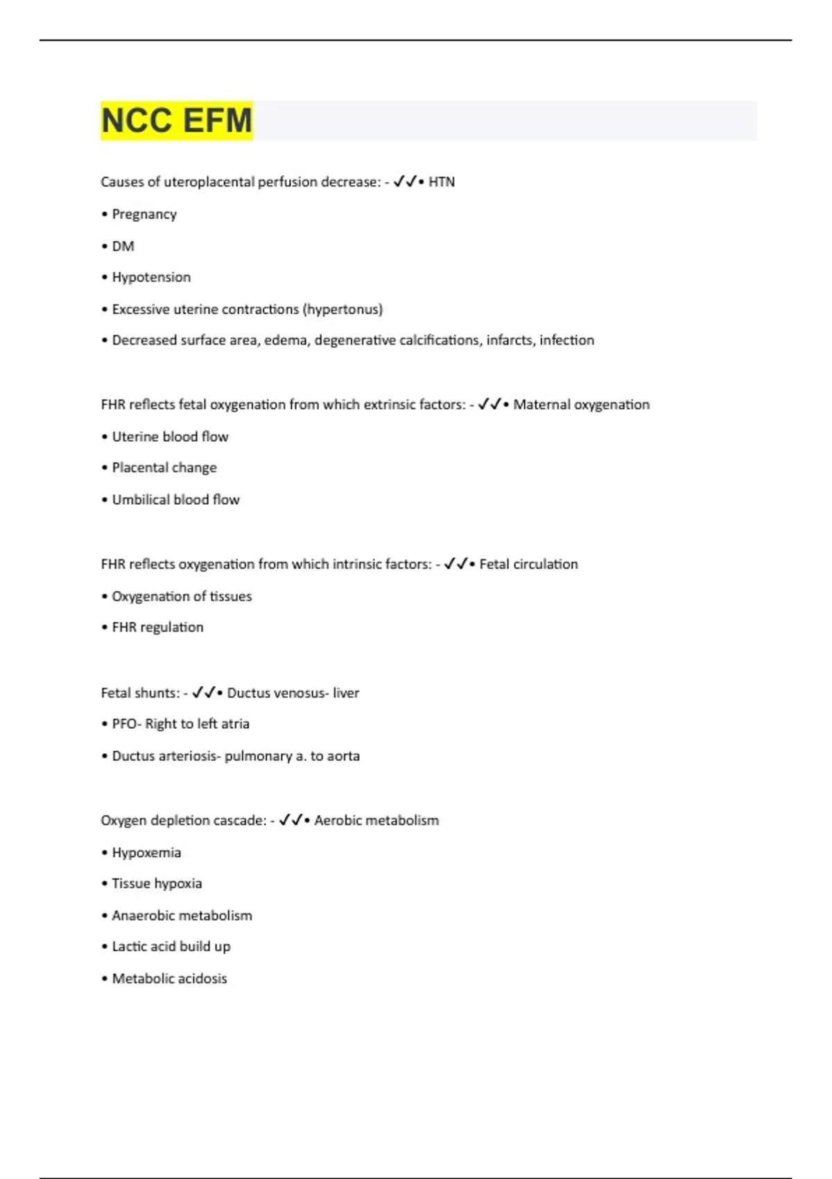 Causes of uteroplacental perfusion decrease: - • HTN • Pregnancy • DM • Hypotension • Excessive uterine contractions (hypertonus) • Decreased surface area, edema, degenerative calcifications, infarcts, infection FHR reflects fetal oxygenation from which extrinsic factors: - • Maternal oxygenation • Uterine blood flow • Placental change • Umbilical blood flow FHR reflects oxygenation from which intrinsic factors: - • Fetal circulation • Oxygenation of tissues • FHR regulation Fetal shunts: - • Ductus venosus- liver • PFO- Right to left atria • Ductus arteriosis- pulmonary a. to aorta Oxygen depletion cascade: - • Aerobic metabolism • Hypoxemia • Tissue hypoxia • Anaerobic metabolism • Lactic acid build up • Metabolic acidosi