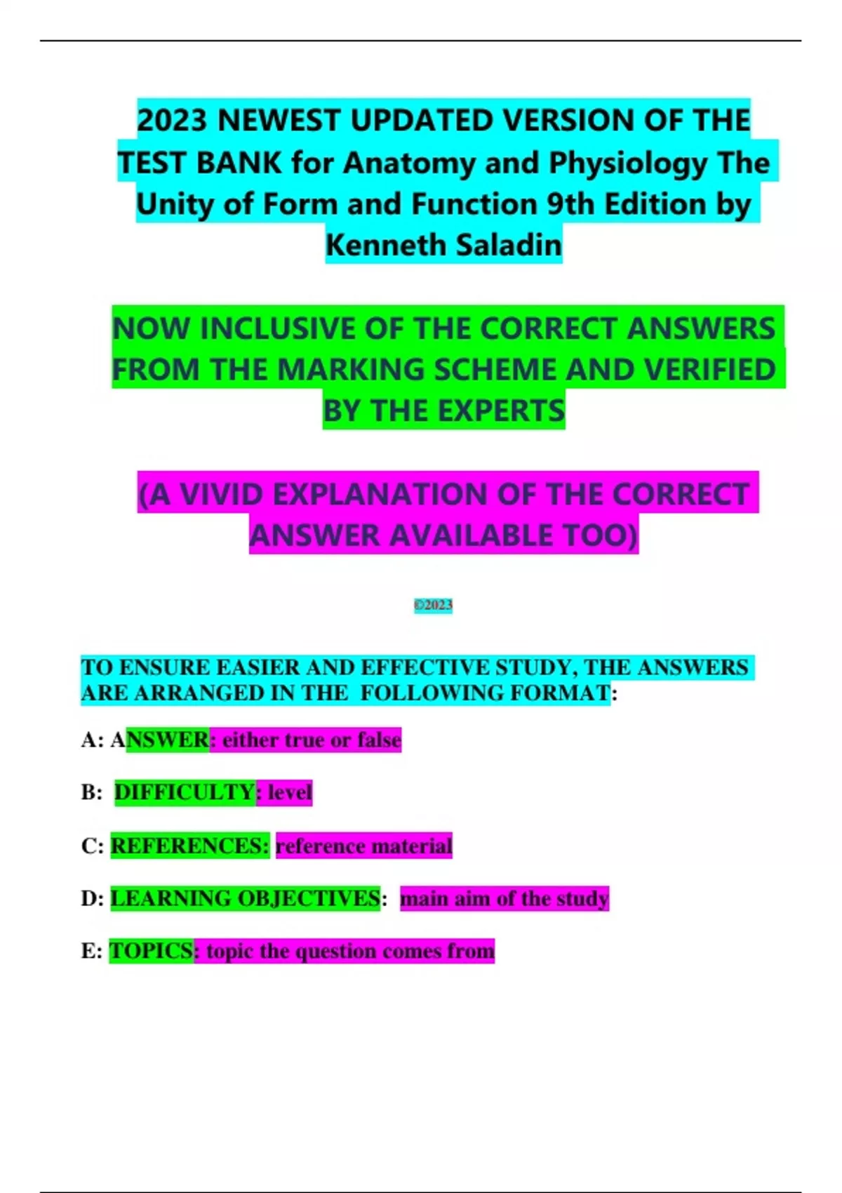 2023 NEWEST UPDATED VERSION OF THE TEST BANK for Anatomy and Physiology The Unity of Form and Function 9th Edition by Kenneth Saladin NOW INCLUSIVE OF THE CORRECT ANSWERS FROM THE MARKING SCHEME AND VERIFIED BY THE EXPERTS (A VIVID EXPLANATION OF THE CORRECT ANSWER AVAILABLE TOO) ©2023 TO ENSURE EASIER AND EFFECTIVE STUDY, THE ANSWERS ARE ARRANGED IN THE FOLLOWING FORMAT: A: ANSWER: either true or false B: DIFFICULTY: level C: REFERENCES: reference material D: LEARNING OBJECTIVES: main aim of the study E: TOPICS: topic the question comes from