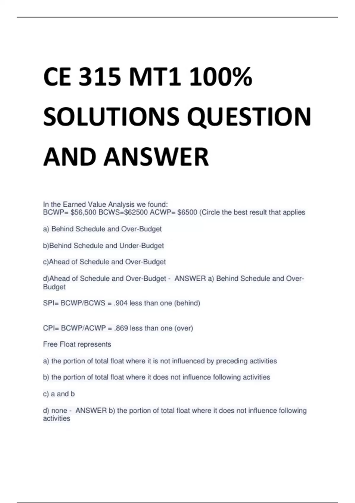 CE 315 MT1 100% SOLUTIONS QUESTION AND ANSWER In the Earned Value Analysis we found: BCWP= $56,500 BCWS=$62500 ACWP= $6500 (Circle the best result that applies a) Behind Schedule and Over-Budget b)Behind Schedule and Under-Budget c)Ahead of Schedule and Over-Budget d)Ahead of Schedule and Over-Budget - ANSWER a) Behind Schedule and OverBudget SPI= BCWP/BCWS = .904 less than one (behind) CPI= BCWP/ACWP = .869 less than one (over) Free Float represents a) the portion of total float where it is not influenced by preceding activities b) the portion of total float where it does not influence following activities c) a and b d) none - ANSWER b) the portion of total float where it does not influence following activities Where there is a 5-day lag between the end of activity A and the start of activity of B, then: a) Activity B has to wait exactly 5 days after the completion of Activity A before it can start b) Activity B has to wait at least 5 days after the completion of Activity A before it can start c) Activity B has to wait at most 5 days after the completion of Activity A before it can start d) Activity B cannot take more than 5 days in duration - ANSWER b) Activity B has to wait at least 5 days after the completion of Activity A before it can start Your critical path is 59 days long. The next longest path is 56 days a) if you extend the longest path by 5 days, the entire projects duration will increase by 5 days. true or false - ANSWER true