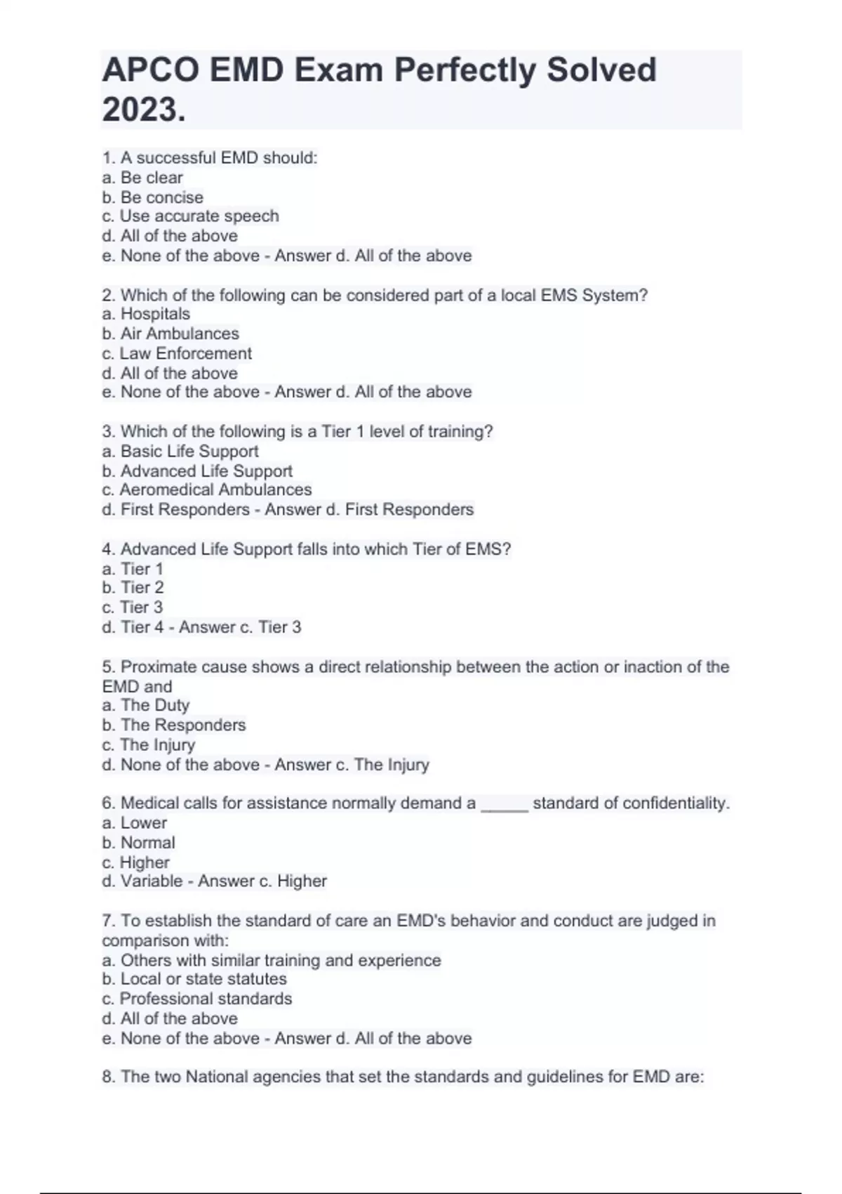 1. A successful EMD should: a. Be clear b. Be concise c. Use accurate speech d. All of the above e. None of the above - Answer d. All of the above 2. Which of the following can be considered part of a local EMS System? a. Hospitals b. Air Ambulances c. Law Enforcement d. All of the above e. None of the above - Answer d. All of the above 3. Which of the following is a Tier 1 level of training? a. Basic Life Support b. Advanced Life Support c. Aeromedical Ambulances d. First Responders - Answer d. First Responders 4. Advanced Life Support falls into which Tier of EMS? a. Tier 1 b. Tier 2 c. Tier 3 d. Tier 4 - Answer c. Tier 3 5. Proximate cause shows a direct relationship between the action or inaction of the EMD and a. The Duty b. The Responders c. The Injury d. None of the above - Answer c. The Injury 6. Medical calls for assistance normally demand a _____ standard of confidentiality. a. Lower b. Normal c. Higher d. Variable - Answer c. Higher 7. To establish the standard of care an EMD's behavior and conduct are judged in comparison with: a. Others with similar training and experience b. Local or state statutes c. Professional standards d. All of the above e. None of the above - Answer d. All of the above