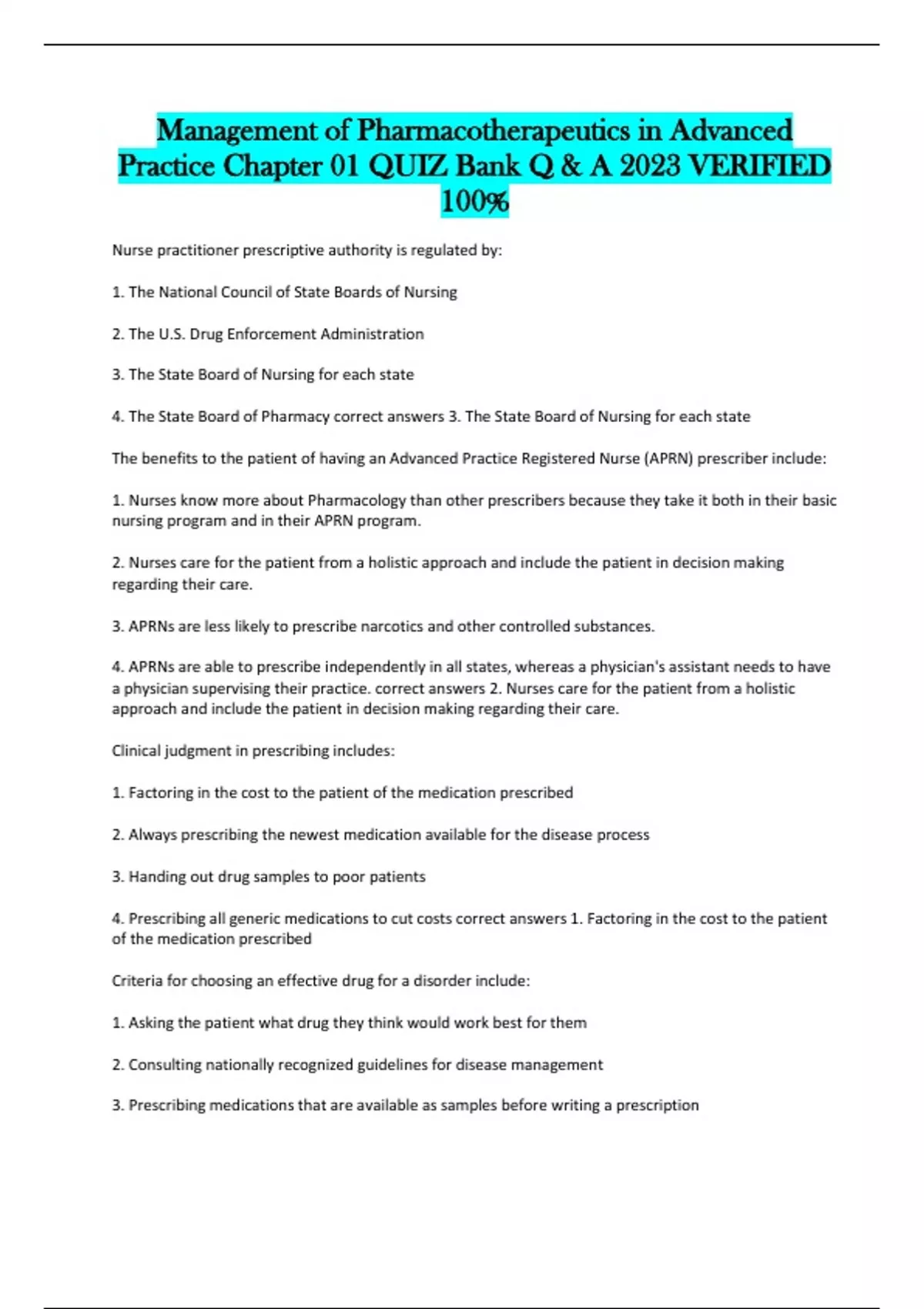 Management of Pharmacotherapeutics in Advanced Practice Chapter 01 QUIZ Bank Q & A 2023 VERIFIED 100% Nurse practitioner prescriptive authority is regulated by: 1. The National Council of State Boards of Nursing 2. The U.S. Drug Enforcement Administration 3. The State Board of Nursing for each state 4. The State Board of Pharmacy correct answers 3. The State Board of Nursing for each state The benefits to the patient of having an Advanced Practice Registered Nurse (APRN) prescriber include: 1. Nurses know more about Pharmacology than other prescribers because they take it both in their basic nursing program and in their APRN program. 2. Nurses care for the patient from a holistic approach and include the patient in decision making regarding their care. 3. APRNs are less likely to prescribe narcotics and other controlled substances. 4. APRNs are able to prescribe independently in all states, whereas a physician's assistant needs to have a physician supervising their practice. correct answers 2. Nurses care for the patient from a holistic approach and include the patient in decision making regarding their care. Clinical judgment in prescribing includes: 1. Factoring in the cost to the patient of the medication prescribed 2. Always prescribing the newest medication available for the disease process 3. Handing out drug samples to poor patients 4. Prescribing all generic medications to cut costs correct answers 1. Factoring in the cost to the patient of the medication prescribed Criteria for choosing an effective drug for a disorder include: 1. Asking the patient what drug they think would work best for them 2. Consulting nationally recognized guidelines for disease management 3. Prescribing medications that are available as samples before writing a prescription 4. Following U.S. Drug Enforcement Administration guidelines for prescribing correct answers 2. Consulting nationally recognized guidelines for disease management Nurse practitioner practice may thrive under health-care reform because of: 1. The demonstrated ability of nurse practitioners to control costs and improve patient outcomes 2. The fact that nurse practitioners will be able to practice independently 3. The fact that nurse practitioners will have full reimbursement under health-care reform 4. The ability to shift accountability for Medicaid to the state level correct answers 1. The demonstrated ability of nurse practitioners to control costs and improve patient outcomes A patient's nutritional intake and laboratory results reflect hypoalbuminemia. This is critical to prescribing because: 1. Distribution of drugs to target tissue may be affected. 2. The solubility of the drug will not match the site of absorption. 3. There will be less free drug available to generate an effect. 4. Drugs bound to albumin are readily excreted by the kidneys. correct answers 1. Distribution of drugs to target tissue may be affected. Drugs that have a significant first-pass effect: 1. Must be given by the enteral (oral) route only 2. Bypass the hepatic circulation 3. Are rapidly metabolized by the liver and may have little if any desired action 4. Are converted by the liver to more active and fat-soluble forms correct answers 3. Are rapidly metabolized by the liver and may have little if any desired action The route of excretion of a volatile drug will likely be the: 1. Kidneys 2. Lungs 3. Bile and feces 4. Skin correct answers 2. Lungs Medroxyprogesterone (Depo Provera) is prescribed intramuscularly (IM) to create a storage reservoir of the drug. Storage reservoirs: 1. Assure that the drug will reach its intended target tissue 2. Are the reason for giving loading doses 3. Increase the length of time a drug is available and active 4. Are most common in collagen tissues correct answers 3. Increase the length of time a drug is available and active The NP chooses to give cephalexin every 8 hours based on knowledge of the drug's: 1. Propensity to go to the target receptor 2. Biological half-life 3. Pharmacodynamics 4. Safety and side effects correct answers 2. Biological half-life Azithromycin dosing requires that the first day's dosage be twice those of the other 4 days of the prescription. This is considered a loading dose. A loading dose: 1. Rapidly achieves drug levels in the therapeutic range 2. Requires four- to five-half-lives to attain 3. Is influenced by renal function 4. Is directly related to the drug circulating to the target tissues correct answers 1. Rapidly achieves drug levels in the therapeutic range The point in time on the drug concentration curve that indicates the first sign of a therapeutic effect is the: 1. Minimum adverse effect level 2. Peak of action 3. Onset of action 4. Therapeutic range correct answers 3. Onset of action Phenytoin requires that a trough level be drawn. Peak and trough levels are done: 1. When the drug has a wide therapeutic range 2. When the drug will be administered for a short time only 3. When there is a high correlation between the dose and saturation of receptor sites 4. To determine if a drug is in the therapeutic range correct answers 4. To determine if a drug is in the therapeutic range A laboratory result indicates that the peak level for a drug is above the minimum toxic concentration. This means that the: 1. Concentration will produce therapeutic effects 2. Concentration will produce an adverse response 3. Time between doses must be shortened 4. Duration of action of the drug is too long correct answers 2. Concentration will produce an adverse response Drugs that are receptor agonists may demonstrate what property? 1. Irreversible binding to the drug receptor site 2. Upregulation with chronic use 3. Desensitization or downregulation with continuous use 4. Inverse relationship between drug concentration and drug action correct answers 3. Desensitization or downregulation with continuous use Drugs that are receptor antagonists, such as beta blockers, may cause: 1. Downregulation of the drug recepto