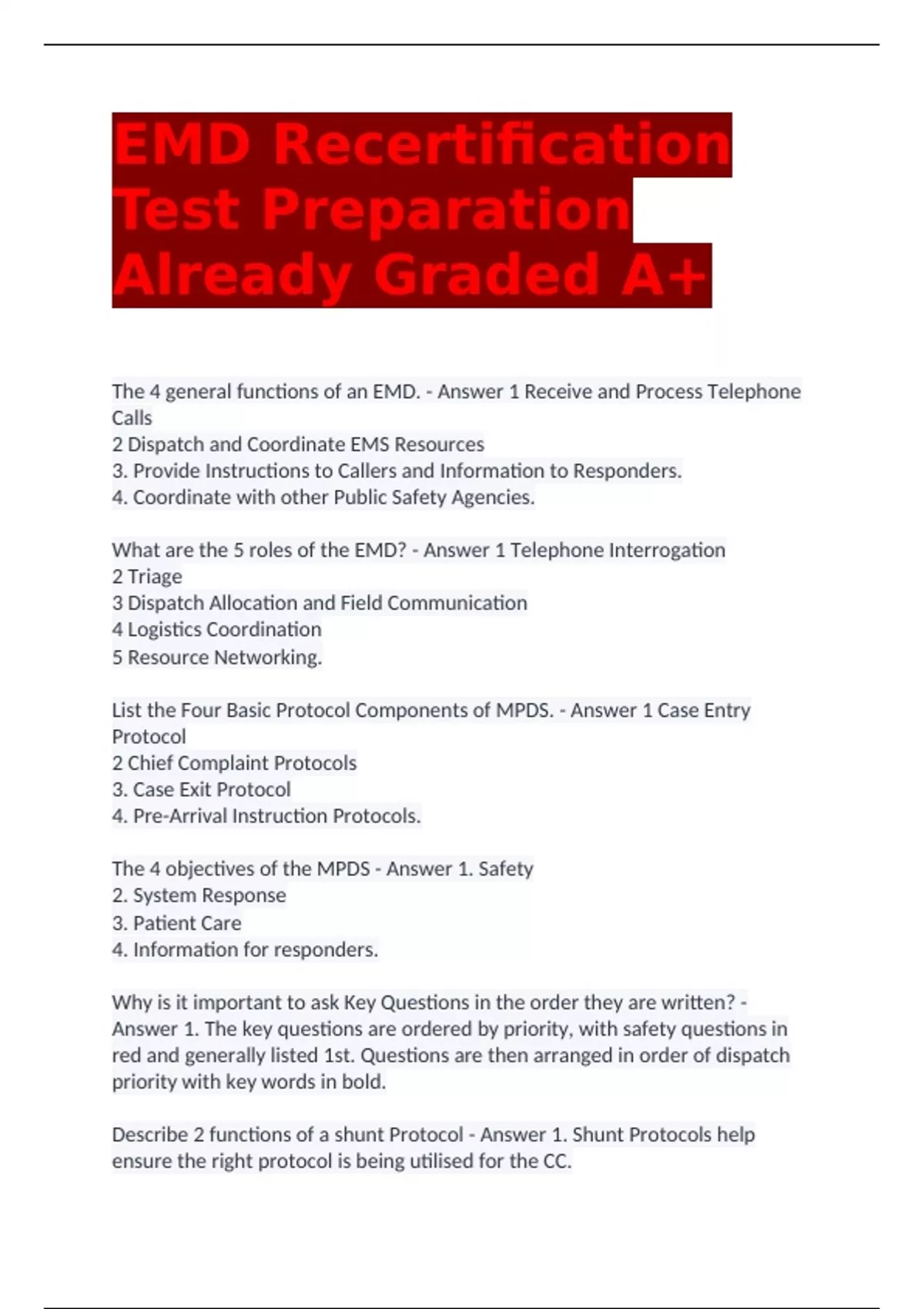 Two Functions of a ECHO Determinant Level. - Answer 1. In certain life threatening situations, it allows you to set a preplanned response into motion early. 2. Provides a means for assigning response-capable units that would not normally respond to EMS calls. PDI - Answer Post Dispatch Instructions PAI - Answer Pre-Arrival Instructions CC - Answer Chief Complaint Special Caller Situations - Answer Elderly Callers Child Callers Mentally Ill Callers Foreign-Language Callers Speech and Hearing Impaired Callers Emotional Callers 5 Techniques of Call Management - Answer 1. Minimising call-Processing gaps 2. Focus on the callers message, NOT the way it is delivered 3. Acknowledge the caller's emotion 4. Using calming techniques throughout the call. 5. Use repetitive persistance when necessary. What is the difference between field and DLS assessment? - Answer The field provider is able to use all senses to assess a scene and the patient/s. The EMD relies on the caller answering structured protocol driven questions to help priorotise the key symptoms. Repititive Persistance - Answer 1. Combine a command with a reason. 2. Firm but caring tone. 3. Repeat it Verbatim. The 4 essential elements of "Negligence" - Answer 1. Duty 2. Breach of duty 3. Injury/damage/suffering 4. Causation Order of priority for Chief Complaint - Answer 1. Safety Related 2. = Trauma choose mechanism of injury 3. = Medical choose foremost symptom. 4. CC = fitting goto protocol 12 regardless of LOC & Breathing Status DLS - Answer Dispatch Life Support 7 Protocols of Case Evaluation - Answer 1. Case Entry 2. CC section 3. Key Questions 4. Dispatch Life Support Instructions 5. Diagnostic & Instruments Tools 6. Final Coding 7. Customer Service.