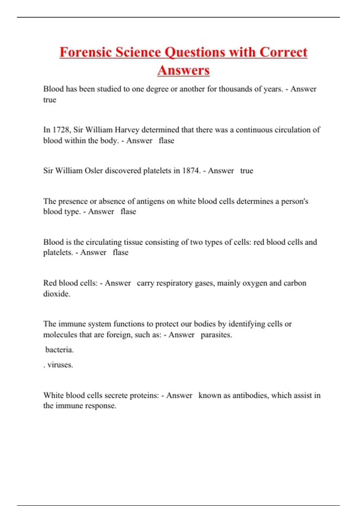 Blood has been studied to one degree or another for thousands of years. - Answer true In 1728, Sir William Harvey determined that there was a continuous circulation of blood within the body. - Answer flase Sir William Osler discovered platelets in 1874. - Answer true The presence or absence of antigens on white blood cells determines a person's blood type. - Answer flase Blood is the circulating tissue consisting of two types of cells: red blood cells and platelets. - Answer flase Red blood cells: - Answer carry respiratory gases, mainly oxygen and carbon dioxide. The immune system functions to protect our bodies by identifying cells or molecules that are foreign, such as: - Answer parasites. bacteria. . viruses.
