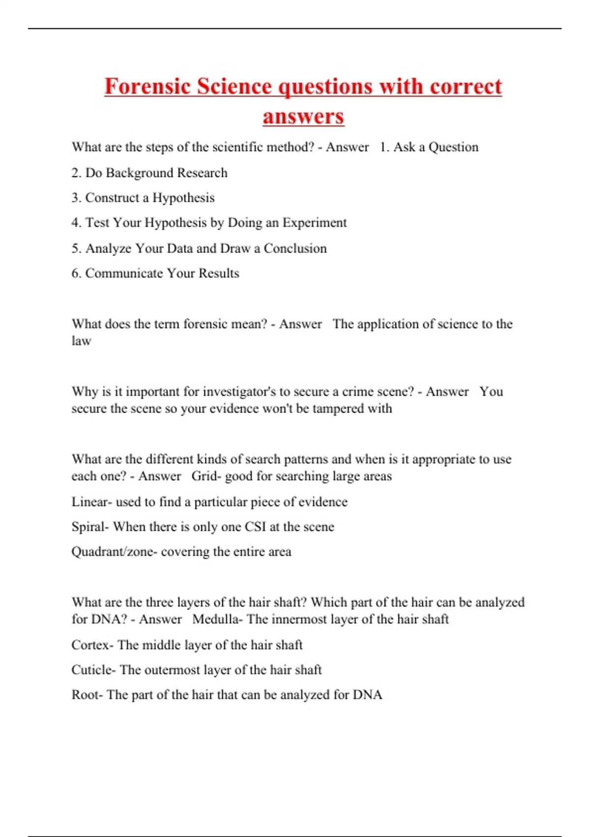 What are the steps of the scientific method? - Answer 1. Ask a Question 2. Do Background Research 3. Construct a Hypothesis 4. Test Your Hypothesis by Doing an Experiment 5. Analyze Your Data and Draw a Conclusion 6. Communicate Your Results What does the term forensic mean? - Answer The application of science to the law Why is it important for investigator's to secure a crime scene? - Answer You secure the scene so your evidence won't be tampered with What are the different kinds of search patterns and when is it appropriate to use each one? - Answer Grid- good for searching large areas Linear- used to find a particular piece of evidence Spiral- When there is only one CSI at the scene Quadrant/zone- covering the entire area What are the three layers of the hair shaft? Which part of the hair can be analyzed for DNA? - Answer Medulla- The innermost layer of the hair shaft Cortex- The middle layer of the hair shaft Cuticle- The outermost layer of the hair shaft Root- The part of the hair that can be analyzed for DNA