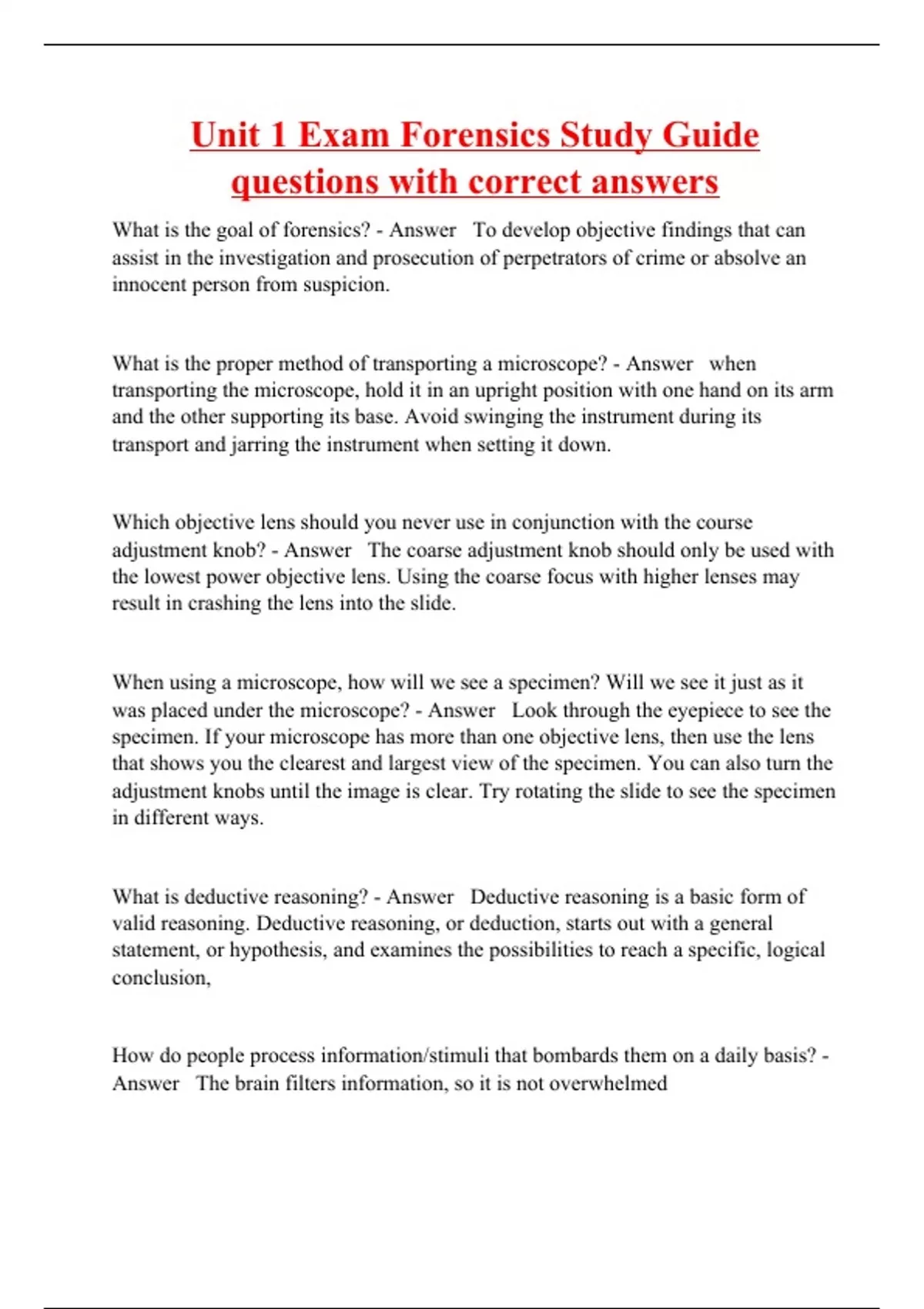What is the goal of forensics? - Answer To develop objective findings that can assist in the investigation and prosecution of perpetrators of crime or absolve an innocent person from suspicion. What is the proper method of transporting a microscope? - Answer when transporting the microscope, hold it in an upright position with one hand on its arm and the other supporting its base. Avoid swinging the instrument during its transport and jarring the instrument when setting it down. Which objective lens should you never use in conjunction with the course adjustment knob? - Answer The coarse adjustment knob should only be used with the lowest power objective lens. Using the coarse focus with higher lenses may result in crashing the lens into the slide. When using a microscope, how will we see a specimen? Will we see it just as it was placed under the microscope? - Answer Look through the eyepiece to see the specimen. If your microscope has more than one objective lens, then use the lens that shows you the clearest and largest view of the specimen. You can also turn the adjustment knobs until the image is clear. Try rotating the slide to see the specimen in different ways. What is deductive reasoning? - Answer Deductive reasoning is a basic form of valid reasoning. Deductive reasoning, or deduction, starts out with a general statement, or hypothesis, and examines the possibilities to reach a specific, logical