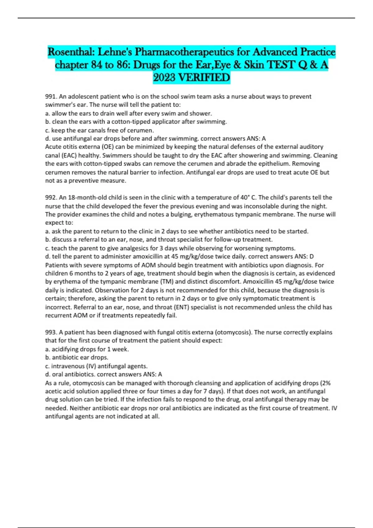 d. use antifungal ear drops before and after swimming. correct answers ANS: A Acute otitis externa (OE) can be minimized by keeping the natural defenses of the external auditory canal (EAC) healthy. Swimmers should be taught to dry the EAC after showering and swimming. Cleaning the ears with cotton-tipped swabs can remove the cerumen and abrade the epithelium. Removing cerumen removes the natural barrier to infection. Antifungal ear drops are used to treat acute OE but not as a preventive measure. 992. An 18-month-old child is seen in the clinic with a temperature of 40° C. The child's parents tell the nurse that the child developed the fever the previous evening and was inconsolable during the night. The provider examines the child and notes a bulging, erythematous tympanic membrane. The nurse will expect to: a. ask the parent to return to the clinic in 2 days to see whether antibiotics need to be started. b. discuss a referral to an ear, nose, and throat specialist for follow-up treatment. c. teach the parent to give analgesics for 3 days while observing for worsening symptoms. d. tell the parent to administer amoxicillin at 45 mg/kg/dose twice daily. correct answers ANS: D Patients with severe symptoms of AOM should begin treatment with antibiotics upon diagnosis. For children 6 months to 2 years of age, treatment should begin when the diagnosis is certain, as evidenced by erythema of the tympanic membrane (TM) and distinct discomfort. Amoxicillin 45 mg/kg/dose twice daily is indicated. Observation for 2 days is not recommended for this child, because the diagnosis is certain; therefore, asking the parent to return in 2 days or to give only symptomatic treatment is incorrect. Referral to an ear, nose, and throat (ENT) specialist is not recommended unless the child has recurrent AOM or if treatments repeatedly fail. 993. A patient has been diagnosed with fungal otitis externa (otomycosis). The nurse correctly explains that for the first course of treatment the patient should expect: a. acidifying drops for 1 week. b. antibiotic ear drops. c. intravenous (IV) antifungal agents. d. oral antibiotics. correct answers ANS: A As a rule, otomycosis can be managed with thorough cleansing and application of acidifying drops (2% acetic acid solution applied three or four times a day for 7 days). If that does not work, an antifungal drug solution can be tried. If the infection fails to respond to the drug, oral antifungal therapy may be needed. Neither antibiotic ear drops nor oral antibiotics are indicated as the first course of treatment. IV antifungal agents are not indicated at all. 994. A provider has told a parent that a 3-year-old child has a minor ear infection and that an antibiotic would be prescribed in a couple of days if the child's symptoms worsened. The parent asks the nurse why the child cannot get an antibiotic today. Which response by the nurse is correct? a. "If the eardrum ruptures, we can culture the fluid to determine which antibiotic is best." b. "Most ear infections are caused by viruses, so antibiotics are not effective." c. "Most ear infections will resolve on their own without antibiotics." d. "Your child will develop tolerance to antibiotics if they are prescribed too often." correct answers ANS: C The vast majority of acute otitis media (AOM) episodes resolve without treatment, so unless the child is very ill, observation is the initial choice. Spontaneous rupture of the tympanic membrane can occur, but clinicians do not wait for it to happen to obtain a culture that will guide treatment. About 70% to 90% of AOM episodes are bacterial in origin. Patients do not develop tolerance to antibiotic effects; overuse of antibiotics can lead to resistant organisms. 995. A 6-year-old child has otitis media and is being treated with amoxicillin [Amoxil] and ibuprofen [Motrin]. The child's parent calls the nurse to report that the child's pain is not relieved with the ibuprofen. The child is afebrile and there is no drainage from either ear. The nurse will discuss which additional treatment with the child's provider? a. Adding acetaminophen [Tylenol] to the pain medication regimen b. Applying antipyrine and benzocaine [Aurodex] solution to the ear canals c. Changing the antibiotic to amoxicillin/clavulanate [Augmentin] d. Performing a tympanostomy to relieve pressure in the middle ear correct answers ANS: B For children over age 5 years, the AAP guidelines recommend topical anesthetic ear drops for pain relief; this is contraindicated if the TM is perforated. This child does not have drainage, indicating intact eardrums. Adding another oral analgesic will not be as effective as a topical anesthetic. The child is afebrile, so there is no concern about a resistant infection. Tympanostomy is not indicated. 996. A nurse is discussing health maintenance with the parent of a newborn infant. Which statement by the parent indicates understanding of ways to reduce the incidence of otitis media? a. "I should hold my baby in an upright position during feeding." b. "I should keep my baby out of day care during cold and flu season." c. "My baby should not use a pacifier after 6 months of age." d. "The pneumococcal vaccine will prevent my baby from getting ear infections." correct answers ANS: B Avoiding child care centers when respiratory infections are prevalent can significantly reduce the incidence of AOM. Holding infants in an upright position is an unproved recommendation. Avoiding pacifier use in the second 6 months of life is an unproved recommendation. The pneumococcal vaccine can slightly reduce the risk of AOM. 997. A 2-year-old child is seen in the clinic in July with otalgia, erythematous, bulging tympanic membranes (TMs), and rupture of the right TM. The child also has a temperature of 39.4° C. The child's parent tells the nurse, "This is the fifth ear infection this year. What can we do?" The nurse will expect the provider to: a. administer ceftriaxone [Rocephin] IM and give t