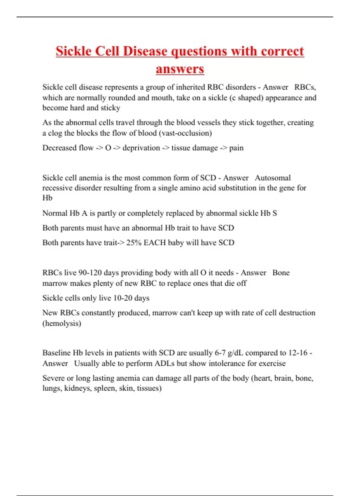 Sickle cell disease represents a group of inherited RBC disorders - Answer RBCs, which are normally rounded and mouth, take on a sickle (c shaped) appearance and become hard and sticky As the abnormal cells travel through the blood vessels they stick together, creating a clog the blocks the flow of blood (vast-occlusion) Decreased flow -> O -> deprivation -> tissue damage -> pain Sickle cell anemia is the most common form of SCD - Answer Autosomal recessive disorder resulting from a single amino acid substitution in the gene for Hb Normal Hb A is partly or completely replaced by abnormal sickle Hb S Both parents must have an abnormal Hb trait to have SCD Both parents have trait-> 25% EACH baby will have SCD RBCs live 90-120 days providing body with all O it needs - Answer Bone marrow makes plenty of new RBC to replace ones that die off Sickle cells only live 10-20 days New RBCs constantly produced, marrow can't keep up with rate of cell destruction (hemolysis) Baseline Hb levels in patients with SCD are usually 6-7 g/dL compared to 12-16 - Answer Usually able to perform ADLs but show intolerance for exercise Severe or long lasting anemia can damage all parts of the body (heart, brain, bone, lungs, kidneys, spleen, skin, tissues) Complications of sickle cell - Answer Pain (SCD), ane